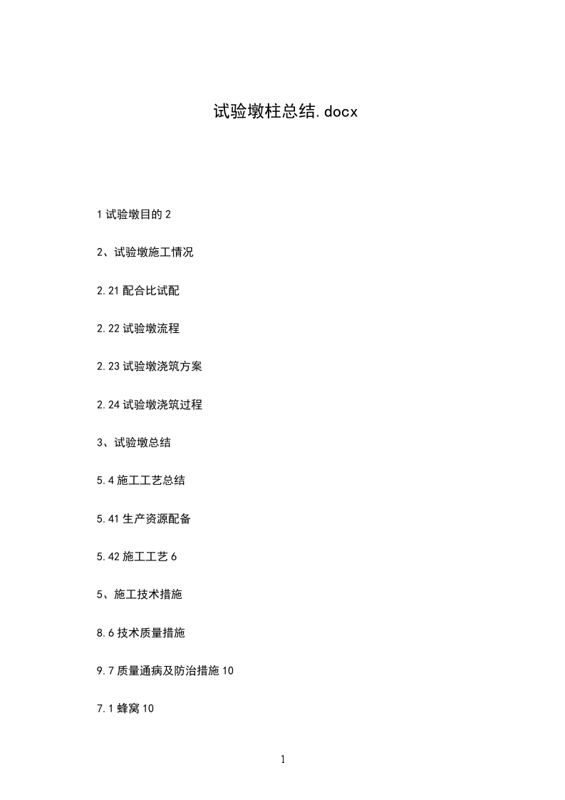 五、综合评价及总结通过试验墩柱首件整个工程施工过程来看,我标段所确定的施工工艺满足墩柱施工的要求,可以用于后期全标段的墩柱施工。通过首件施工,使全体施工人员加深了对墩柱施工工艺的理解,增强了我们质量意识。同时我们也发现了在施工过程中存在的问题,如各工序配合还是略显生疏,首车混凝土塌落度的损耗考虑不周全,针对问题我们吸取了教训也提出了改进措施。在后续施工中我们将发扬首件工程中的优点,继续改进或优化工艺方案,杜绝在首件工程的问题再次发生,优质、安全的完成我标段所有的钻孔桩施工。同时通过对墩柱钢筋加工、混凝土成品的检测,其各项指标符合设计及公路桥涵施工技术规范(JTJ042000)的各项规定及公路工程质量检验评定标准(JTGF82004)的要求。