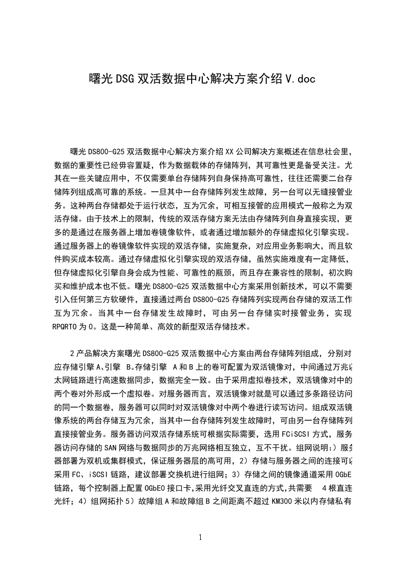 曙光DS800-G25双活数据中心解决方案介绍XX公司解决方案概述在信息社会里,数据的重要性已经毋容置疑,作为数据载体的存储阵列,其可靠性更是备受关注。尤其在一些关键应用中,不仅需要单台存储阵列自身保持高可靠性,往往还需要二台存储阵列组成高可靠的系统。一旦其中一台存储阵列发生故障,另一台可以无缝接管业务。这种两台存储都处于运行状态,互为冗余,可相互接管的应用模式一般称之为双活存储。由于技术上的限制,传统的双活存储方案无法由存储阵列自身直接实现,更多的是通过在服务器上增加卷镜像软件,或者通过增加额外的存储虚拟化引擎实现。通过服务器上的卷镜像软件实现的双活存储,实施复杂,对应用业务影响大,而且软件购买成本较高。通过存储虚拟化引擎实现的双活存储,虽然实施难度有一定降低,但存储虚拟化引擎自身会成为性能、可靠性的瓶颈,而且存在兼容性的限制,初次购买和维护成本也不低。曙光DS800-G25双活数据中心方案采用创新技术,可以不需要引入任何第三方软硬件,直接通过两台DS800-G25存储阵列实现两台存储的双活工作,互为冗余。当其中一台存储发生故障时,可由另一台存储实时接管业务,实现RPQRTO为0。这是一种简单、高效的新型双活存储技术。