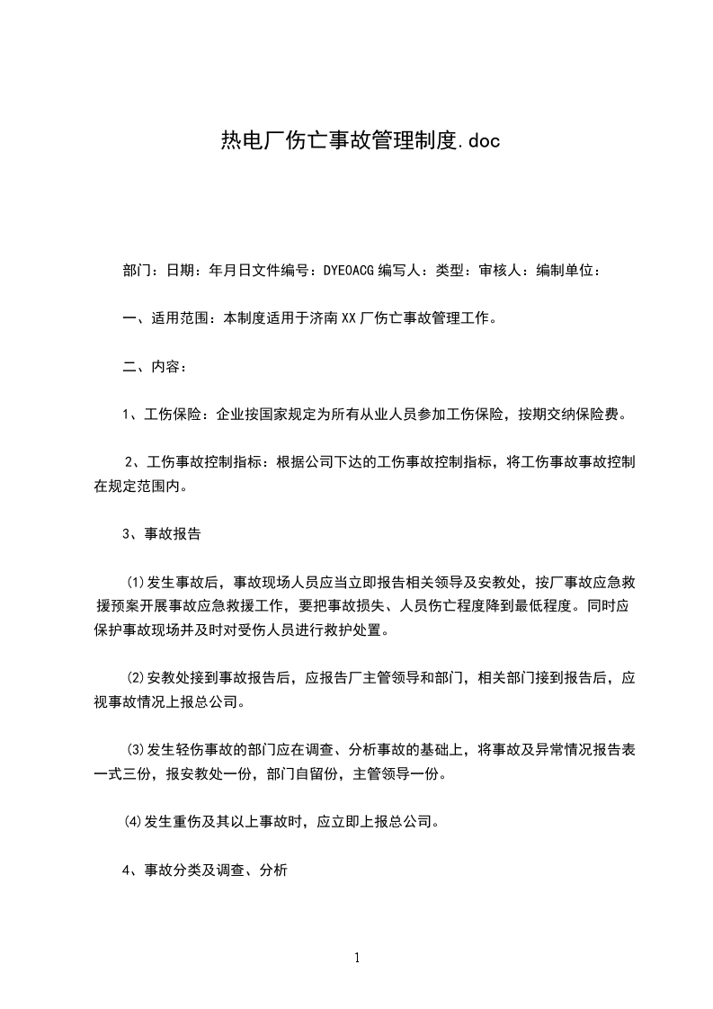 一、适用范围:本制度适用于济南XX厂伤亡事故管理工作。