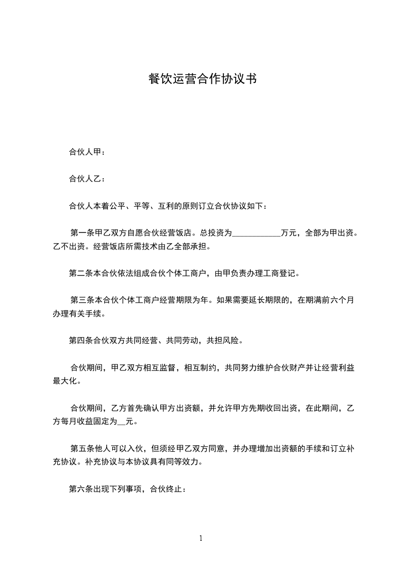 第一条甲乙双方自愿合伙经营饭店。总投资为____________万元,全部为甲出资。乙不出资。经营饭店所需技术由乙全部承担。