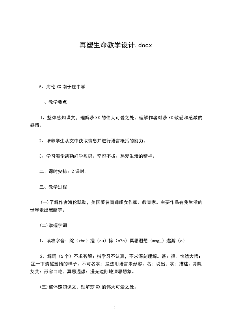 七、课堂总结:回顾生命再塑的历程,想像海X的种种努力以及她所遇到的种种艰辛,我们不难发现:莎XX教给了海X一种认识世界的方式:用自己的爱去感受世界最美好的一面,去善待每一个生命,水是有生命的,大自然是有生命的,爱让我们的生活变得美好,美让海X变得坚强。莎莉文小姐不仅教给海X爱的真谛,她自己也正是用爱改变了海X的人生。