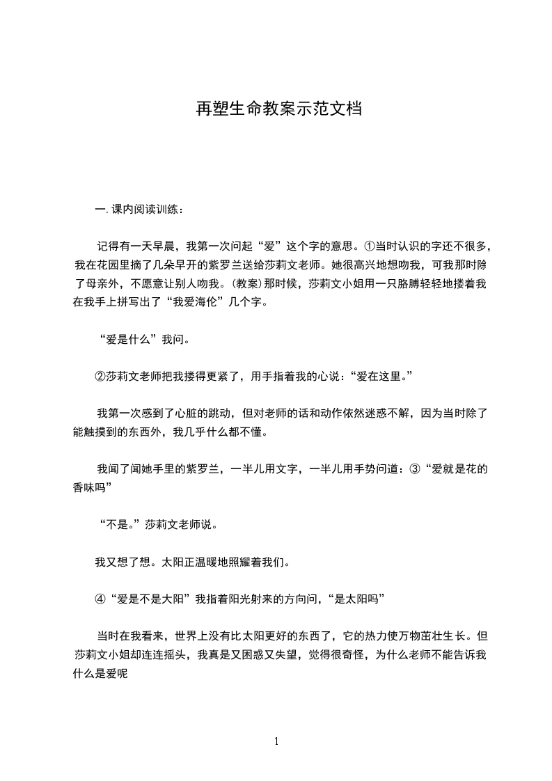 5.请你说说对文章题目“再塑生命”的理解。意指“重新塑造生命、重新获得生命”。这里指海伦的生命希望和热诚在安XX的教育下被唤醒,使她从寂静又黑暗的孤独世界回到了光明和快乐之中莎XX老师让“我”回归自然,理解自然。还教“我”懂得什么是“爱”。正如作者所说“她就是那个来对我启示世间真理,给我深切的爱的人。”从这个意义上讲,莎XX老师就是我的“重生父母”。