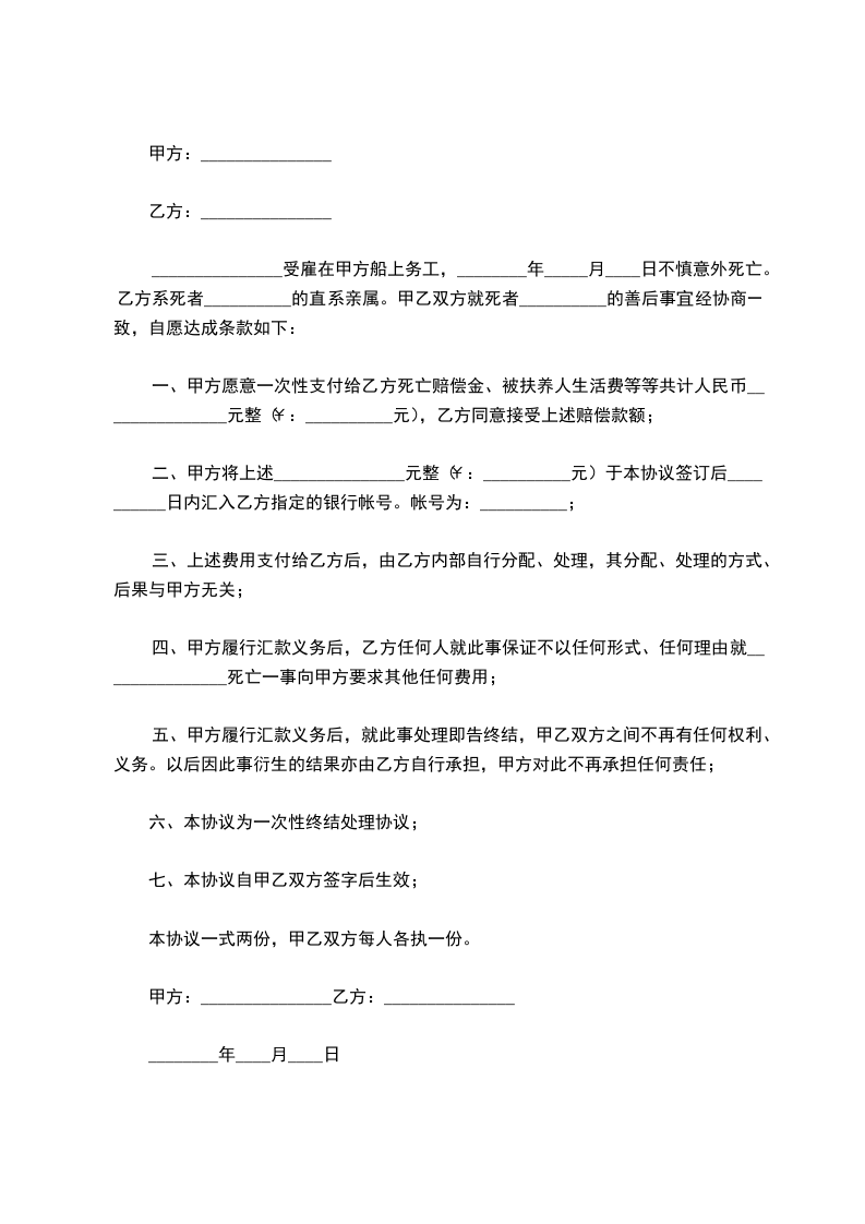 _______________受雇在甲方船上务工,________年_____月____日不慎意外死亡。乙方系死者__________的直系亲属。甲乙双方就死者__________的善后事宜经协商一致,自愿达成条款如下: