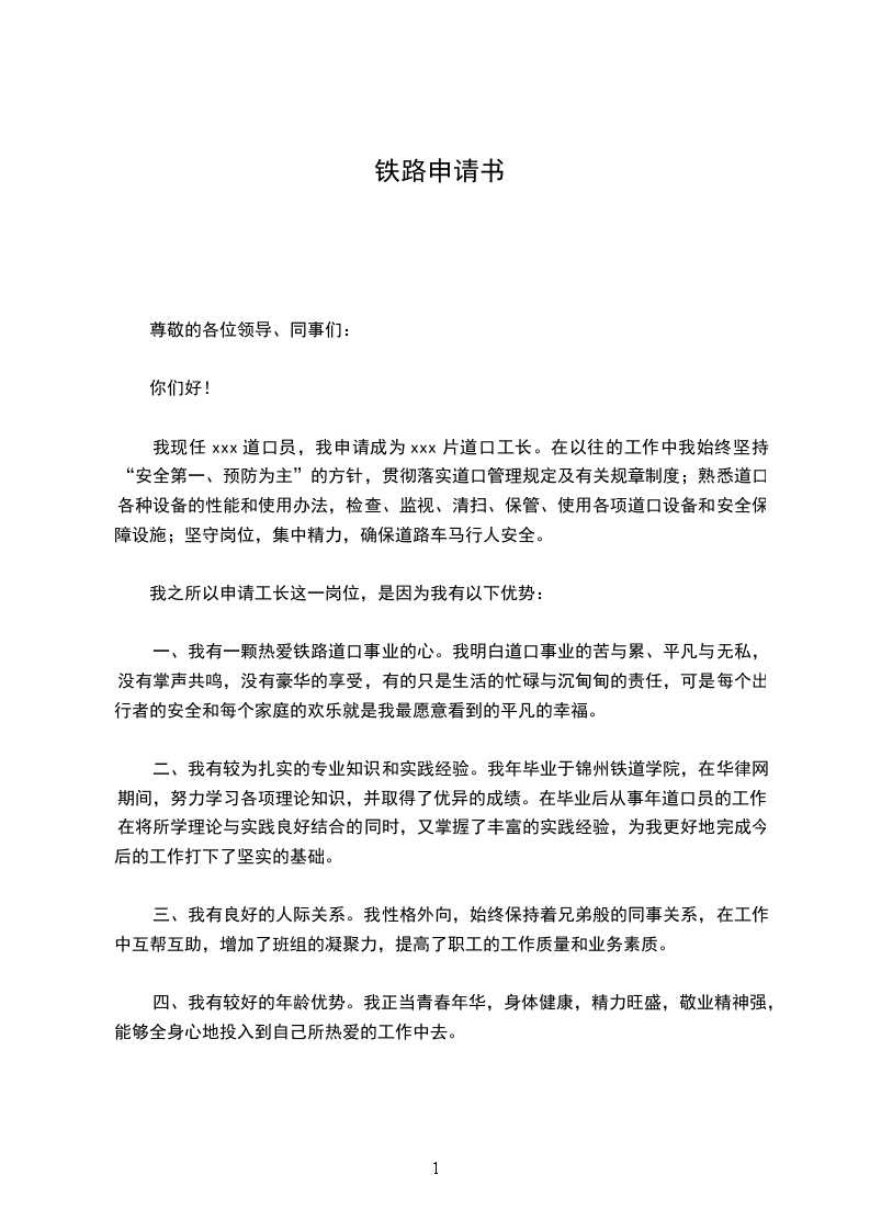 各位领导,同事们,我有信心、有决心做好道口工长工作,我将执着坚韧地挑起我深爱的这一行,为铁路道口事业献出自己的光和热。希望大家能够接受我的申请。