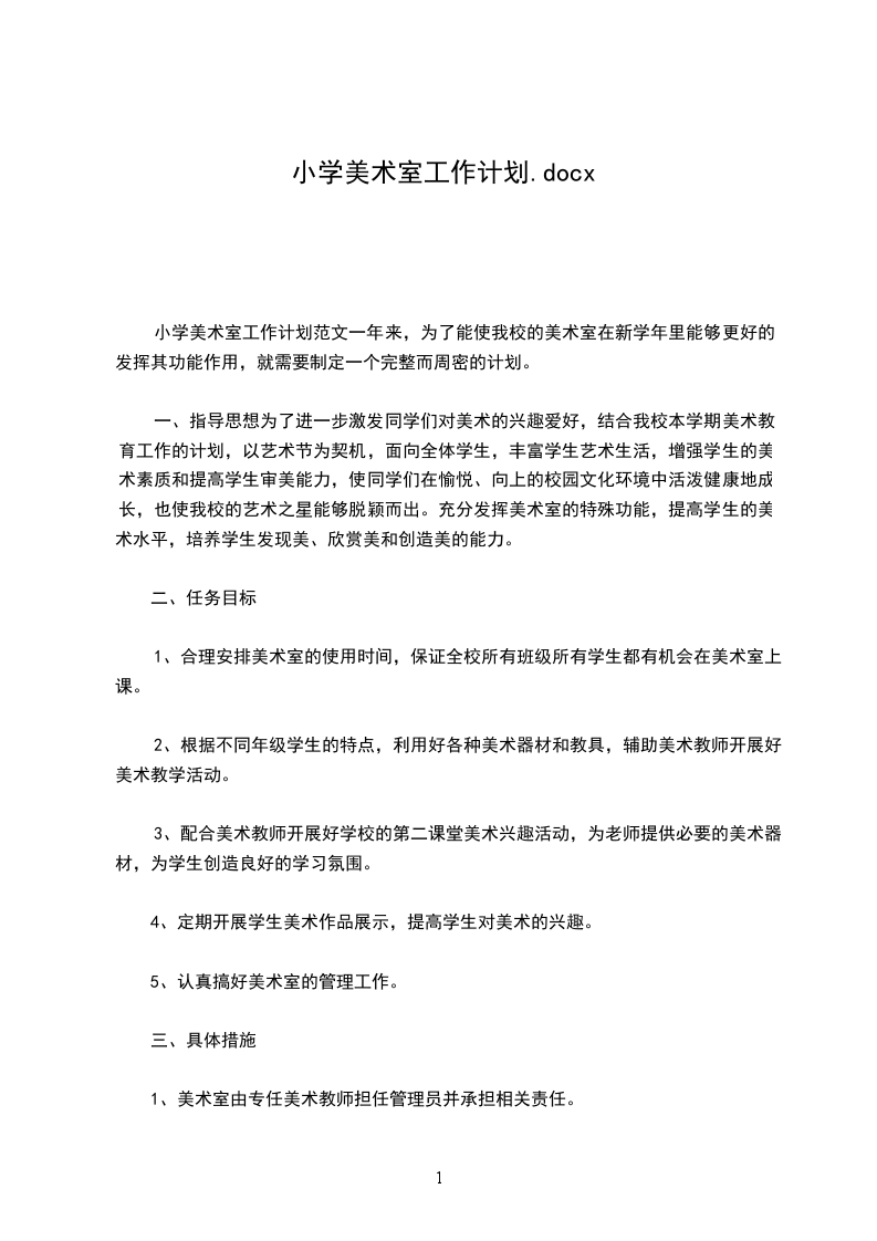 3.5篇二:小学美术室工作计划范文学校的一切工作都是以教学为中心学前做好美术室工作计划对学校推进素质教育、培养学生创新精神和创造能力方面有着重要作用?美术室教学工作由教导处牵头,管理员具体负责管理,各类物品器材的添置等都总务处负责采购?由于分工恰当、落实到位、职责分明。为了推进素质教育,培养学生的创新精神和实践能力,我们充分发挥专用美术室作用。正确使用实物展示台辅助教学?每天轮流安排学生做好美术室的卫生,每班有专门的管理员负责管理,培养了学生的管理能力及爱劳动的热情。由于学校重视学生审美情趣及动手能力培养?美术室的利用率相当高。因此本学期我计划有效、合理利用课后业余时间?将有兴趣的美术爱好者组织起来到美术室开展特色学习?培养他们绘画技能?充分发挥美术室的功能。要求学生课前必须带好学具,按顺序进入美术室,在指定座位上入座,不得随便走动和大声喧哗。保持安静准备上课。上课前需检查自己的美术用具是否齐全,如有缺损及时报告老师。美术室的一切学具只能在美术室上课时使用,不准许私自带出美术室。在上课时要注意安全,不得随便摆弄写生实物模型?如有损坏?立即报告老师?根据情节按规定作出赔偿。下课后,应将凳子按原来位置放好,保持桌面整齐、清洁、关好电开关及窗户。美术室要经常打扫,保持室内外清洁卫生。每学期我将对美术室进行定期检查。篇三:小学美术室工作计划范文