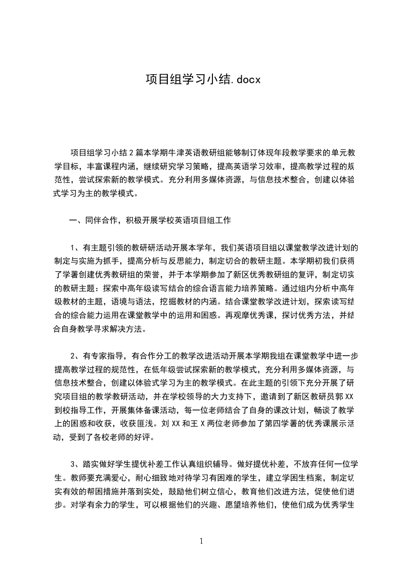 项目组学习小结2篇本学期牛津英语教研组能够制订体现年段教学要求的单元教学目标,丰富课程内涵,继续研究学习策略,提高英语学习效率,提高教学过程的规范性,尝试探索新的教学模式。充分利用多媒体资源,与信息技术整合,创建以体验式学习为主的教学模式。