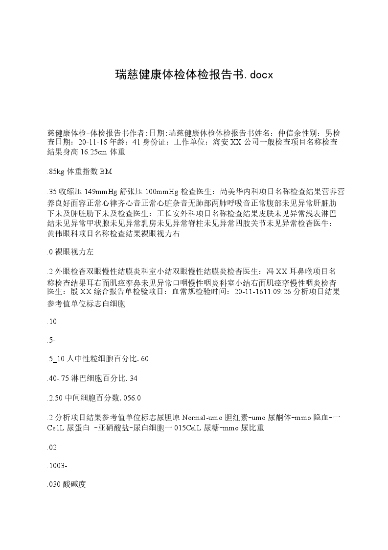 慈健康体检-体检报告书作者:日期:瑞慈健康休检休检报告书姓名:仲信余性别:男检查日期:20-11-16年龄:41身份证:工作单位:海安XX公司一般检查项目名称检查结果身高16.25cm体重