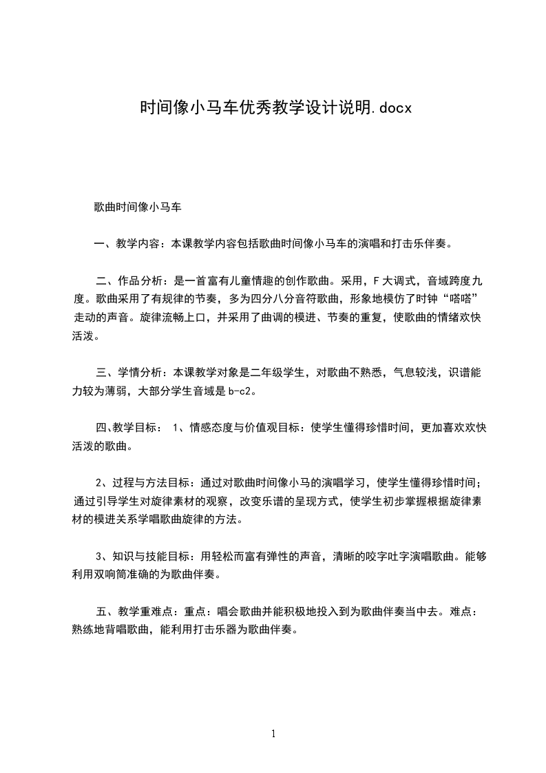 一、教学内容:本课教学内容包括歌曲时间像小马车的演唱和打击乐伴奏。