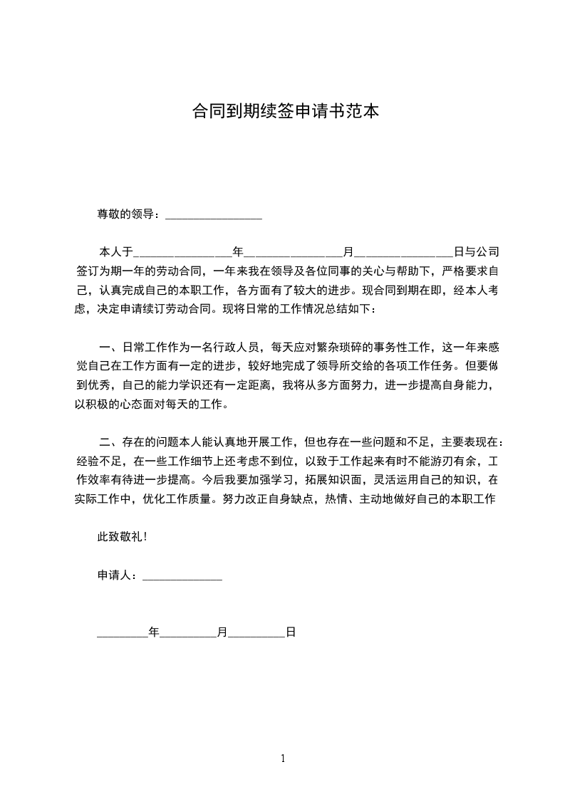 我叫_______________,女,__________岁,大专文化,_____________年__________月与贵单位签订为期两年的劳动合同,现在贵单位_____________营业所上班。两年来,我在单位、领导和同事们的关心、支持下,按照岗位职责要求和行为规范,认认真真地做好了本职工作,较好地完成了领导所交给的各项工作任务。现合同到期在即,经本人考虑,决定申请续订劳动合同,其理由有二: