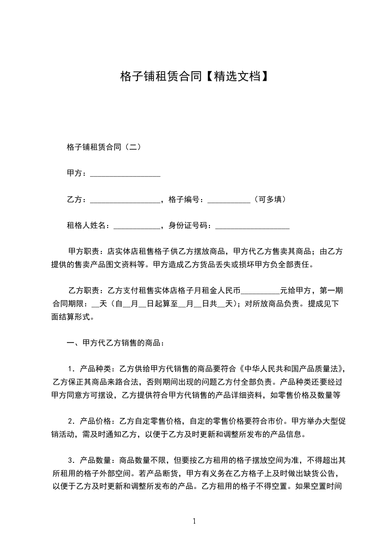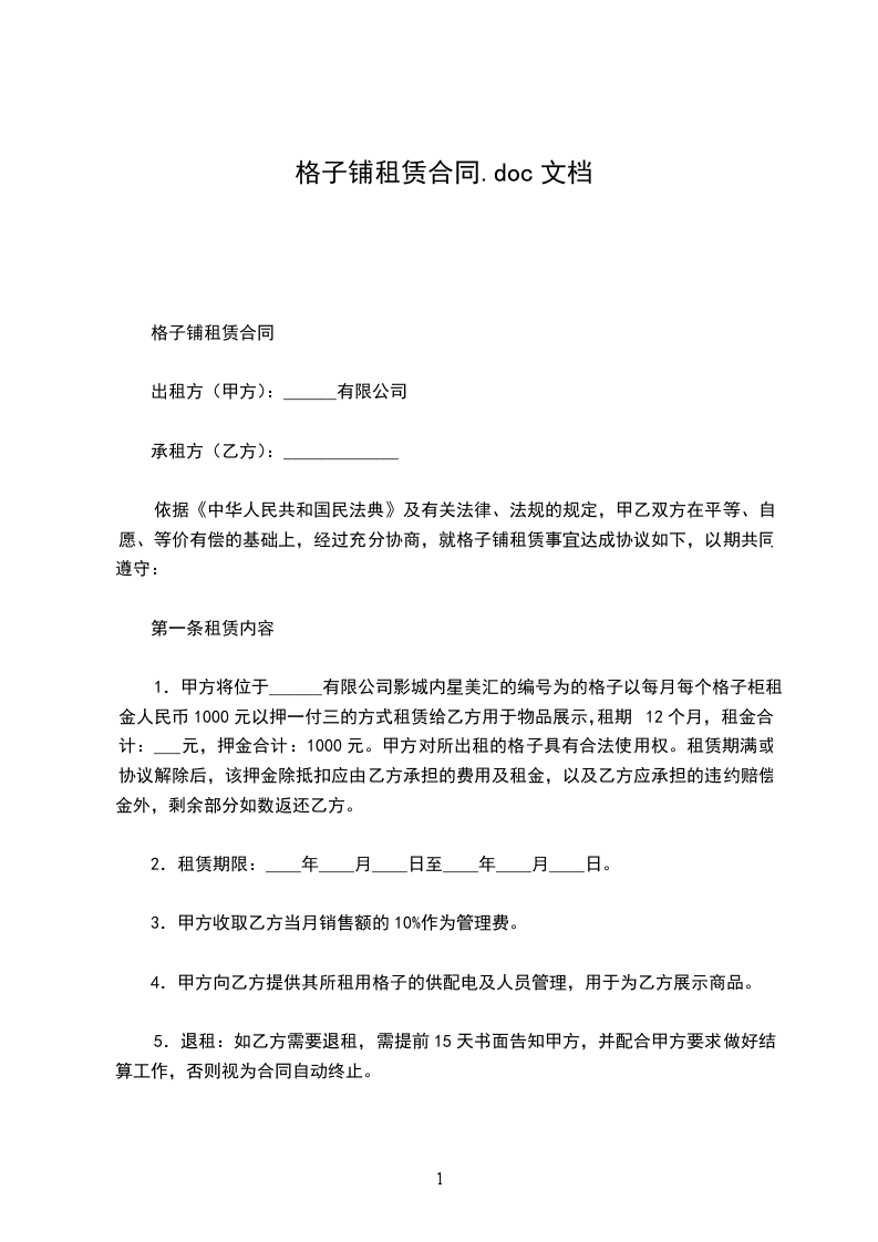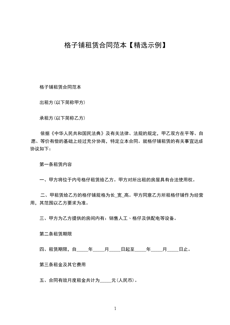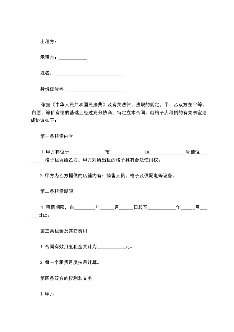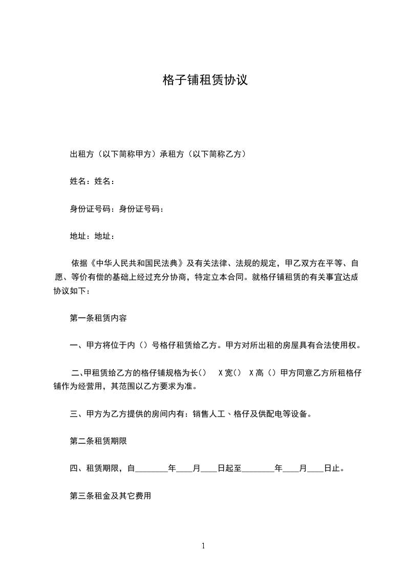 依据《中华人民共和国民法典》及有关法律、法规的规定,甲乙双方在平等、自愿、等价有偿的基础上经过充分协商,特定立本合同。就格仔铺租赁的有关事宜达成协议如下: