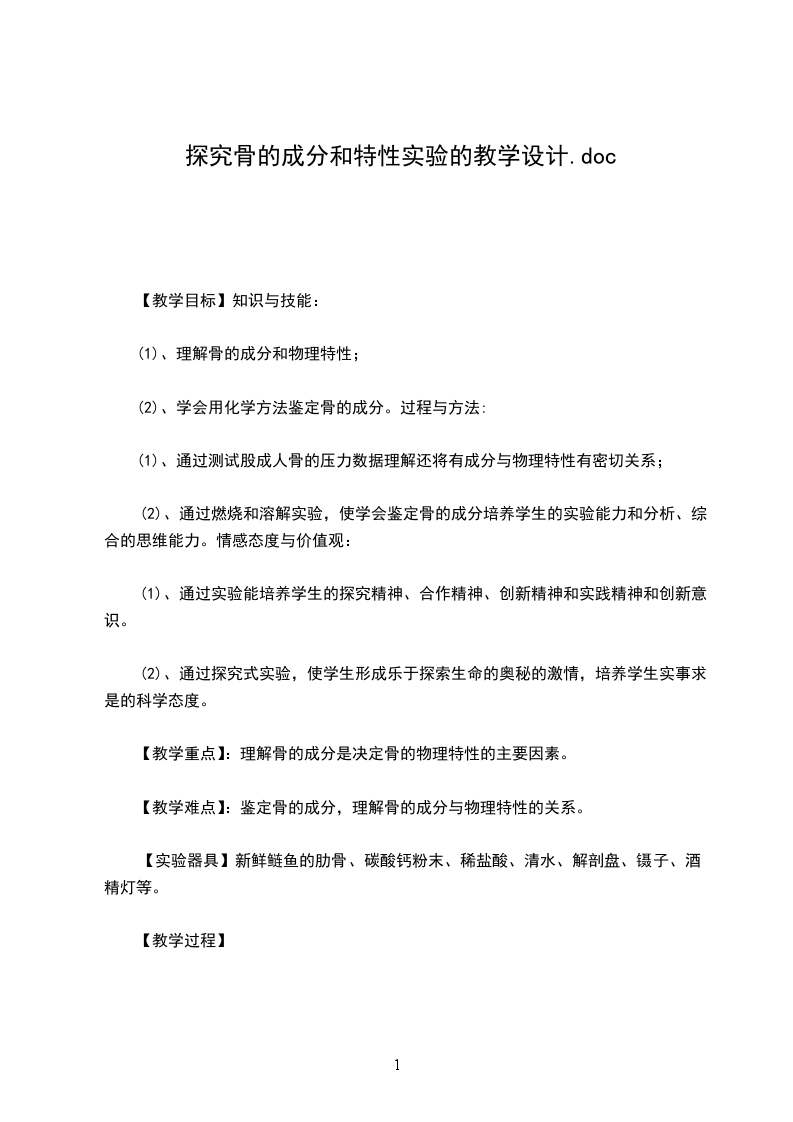 (2)、通过燃烧和溶解实验,使学会鉴定骨的成分培养学生的实验能力和分析、综合的思维能力。情感态度与价值观: