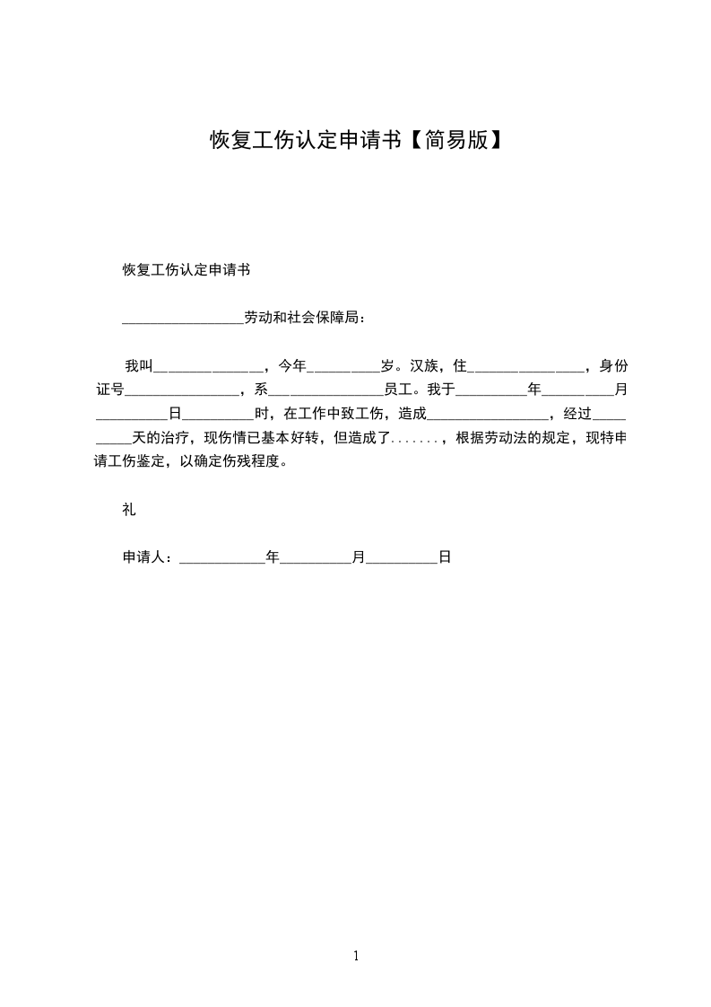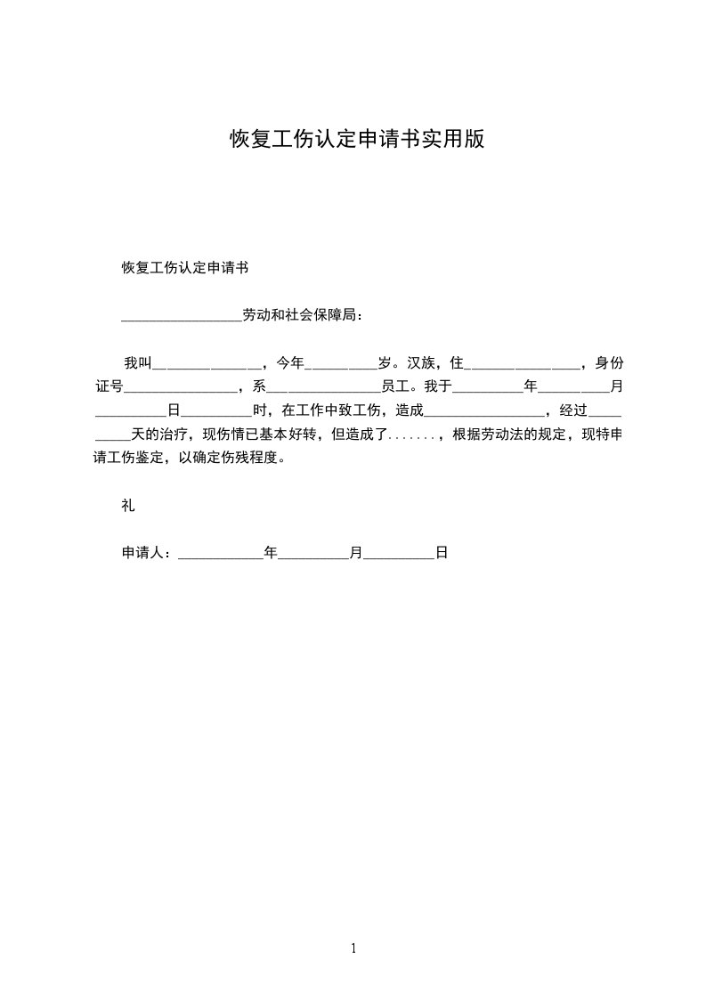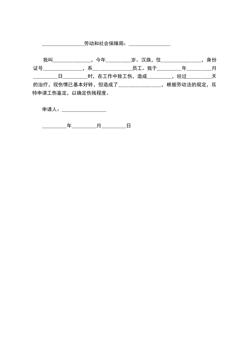我叫_______________,今年__________岁。汉族,住________________,身份证号________________,系________________员工。我于__________年__________月__________日__________时,在工作中致工伤,造成__________,经过__________天的治疗,现伤情已基本好转,但造成了_________________,根据劳动法的规定,现特申请工伤鉴定,以确定伤残程度。