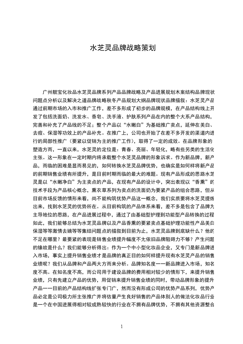 XX芝靈品牌戰略策劃广州XX公司XX芝灵品牌系列广口品口口牌战略及产品发展规划本案结构品牌现状问题点分析以及解决之道品牌战略秋冬产品规划大纲品牌现状.品牌描叙:XX芝灵产品经过前期市场的入市和推广工作,已经形成了初步的品牌规模,在产品结构线上开发了包括洗面奶、洗发XX、香皂、洗手液、护肤系列产品在内的整个大系产品结构,完善和补充了产品线的不足;整个产品以“XX嫩白”为基础推广卖点,延伸在美白、去痘、保湿等功效上的产品补充。在推广上,公司也开始了在已经开发的渠道内进行的局部性推广(主要以促销为主的推广工作),取得了一定的成效。在品牌形象的塑造方面,一直以来,XX芝灵的定位是:青春、亮丽、年轻化,略有些另类的生活化主张。这一形象在一定时期内将承载整个XX芝灵品牌的形象诉求。作为新品牌,新产品,面临的困难是显而易见的,如何转换XX芝灵品牌优势,也就是怎样将新产品的前期销售业绩有所提升,是目前阶段面临的最大的难题。现有产品形成的思路XX芝灵是以“XX嫩净白”为主卖点的产品,在现有产品的设计中,突出表现以“香熏”的技术手段为产品核心概念,熏衣草系列为卖点的洗面奶为主要产品的组合思路,但从目前市场反馈的情况来看,尚不能构筑优势产品这一概念,我们实质要将水XX提炼出来,找到水XX的优势所在。从目前构筑的严品体系来看,基本是包含了品牌为主导地位的思路,在产品发展过程中,经过了由基础型护理到功能型产品转换的过程,这样,我们可以总结为水XX品牌以及产品香熏的主要卖占