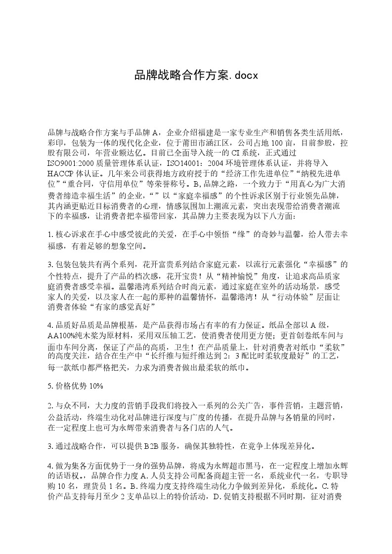 四、跟风策略。选择市场较好的卖点产品,及时更新产品经营战略。品牌竞争战略竞争战略的理论无可否认的是品牌克争(也包括严品克争)在今天市场上已经演化得非常激烈,作为XXX产品走的是一条产品同质化加大的竞争运营模式,在大卫波特的竞争战略当中,提出在当前的中小型企业竞争原则上采用的两种常用模一是总成本领先优势。(他包括公司的直接成本,网络成本,时间成本等等一切因素)二是标新立异的优势。(创新产品形成直接有力的销售主张)这两个竞争原则不仅符合当前公司的主张,也是引导品牌进入良性循环的原则。XXX的品牌主张我们知道,产品的销售业绩是市场决定的,我们设定扩大销售的两个办法:一是增加卖场的销售竞争力。二是增加产品分销渠道提高销售业绩增加卖场销售竞争力增加产品销售渠道不难看出,销售业绩的提升关键是如何在现有的进场做好的前提下,对其他渠道进行多层次的分销。他设计到营销层次的两个方面,即切实加强现有进场的销售。多网点开拓其他渠道销售。怎样提高销售力提高销售力,应该找出与销售相关的环节,在一般而言,销售是涉及到整个品牌的各个部分的销售的五个环节,只有五个环节配套好了,才将有销售力的增加。品牌渠道产品广告价格XXX销售力五个环节的分析品牌:涉及到品牌,我们做任何一件事情是给品牌加分,是为品牌形象服务,在目前不可能形成集中较大的资源推广品牌的前提下,我们理当注重塑造品牌的基础工作,而且,这个基础工作应该是以销售为前提,来带动品牌的形成。渠道:在公司渠道状况不是太乐观的环境下,开发渠道势必涉及到费用的增加,其实可以以借助渠道的方针为产品在前期做推广,增加渠道数量和规模,其实也就是在提高销售业绩。产品:现有的产品目前能否经得起市场的考验,以香熏为技术核心,进而延伸的整个产品大系都有着卖点不很突出,难以塑造强势产品的问题,这就要求我们在对产品研发上着力考虑其本身延伸的张力问题了。广告:广告是公司必要的市场推广技巧和手段,如何稳固市场并产生销售的工具。目前水芝灵的推广几乎处在空白的地位上,难以支撑整个销售业绩。价格:是对销售力的补充。-水芝灵品牌重新定义不难看出的是,水芝灵在某些方面存在着矛盾和缺憾,从消费市场出发和研究,我们看出,水芝灵的品牌定性是什么?解决一个品牌的销售力问题,最开始应该给产品社顶一个方向,这个方向是品牌的指引,也是产品的销售力的一部分。水XX在原由产品基础上的补充产品发展方向:水XX品牌:肌肤水元素形成基础补水、全效补水、高能补水三大系列产品复合组成产品概念,全面修复水与肌肤间的亲和力,形成水到肌肤的营养转变。主要支持概念:柠檬天然酸主要卖点支持:香熏技法理论描叙:通过天然柠檬酸激发水分,形成天然营养水,补充人体皮质的弱酸性水分复合物,并产生高能蛋白,随时补充肌肤所需要。秋冬产品规划大纲秋冬护肤产品系列的发展趋势秋冬产品一直以来就是各大厂家争夺的市场焦点,秋冬系列产品规划与推广重点涉及到一个品牌的定位和战略的转变。从目前市场来看,秋冬产品大致出现在如下的变化。
