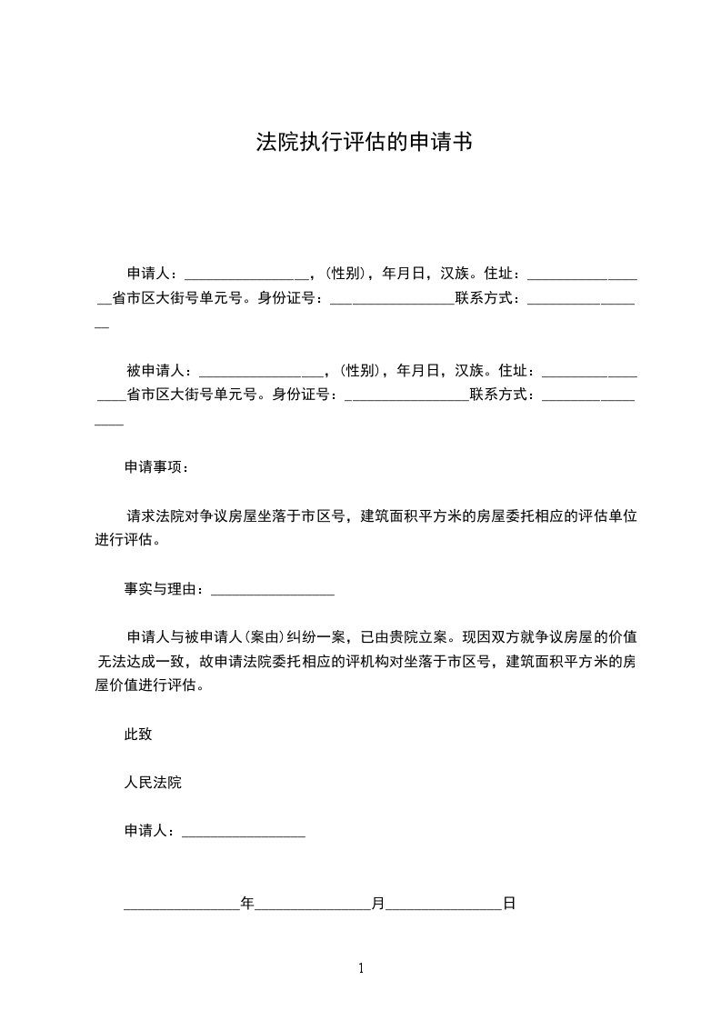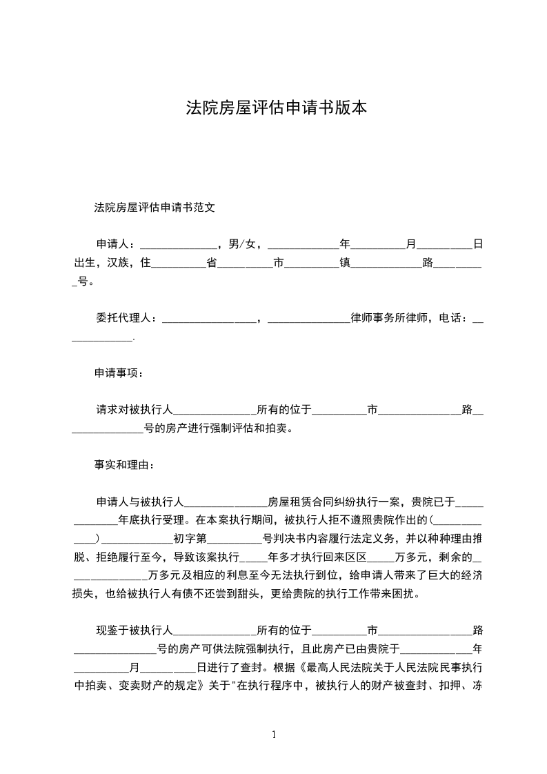 请求对被执行人_______________所有的位于__________市__________路__________号的房产进行强制评估和拍卖。