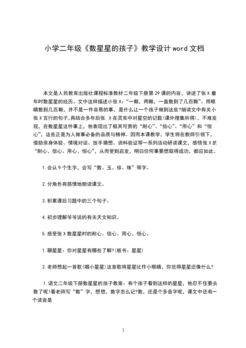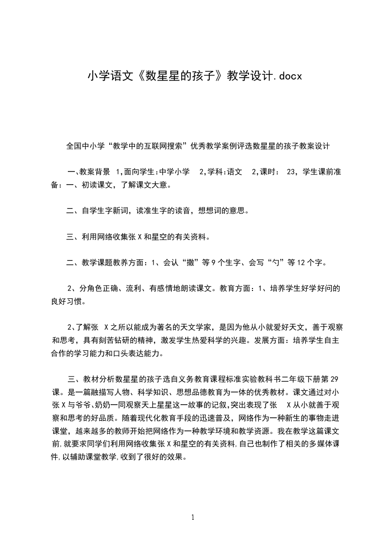 三、教材分析数星星的孩子选自义务教育课程标准实验教科书二年级下册第29课。是一篇融描写人物、科学知识、思想品德教育为一体的优秀教材。课文通过对小张X与爷爷、奶奶一同观察天上星星这一故事的记叙,突出表现了张X从小就善于观察和思考的好品质。随着现代化教育手段的迅速普及,网络作为一种新生的事物走进课堂,越来越多的教师开始把网络作为一种教学环境和教学资源。我在教学这篇课文前,就要求同学们利用网络收集张X和星空的有关资料,自己也制作了相关的多媒体课件,以辅助课堂教学,收到了很好的效果。