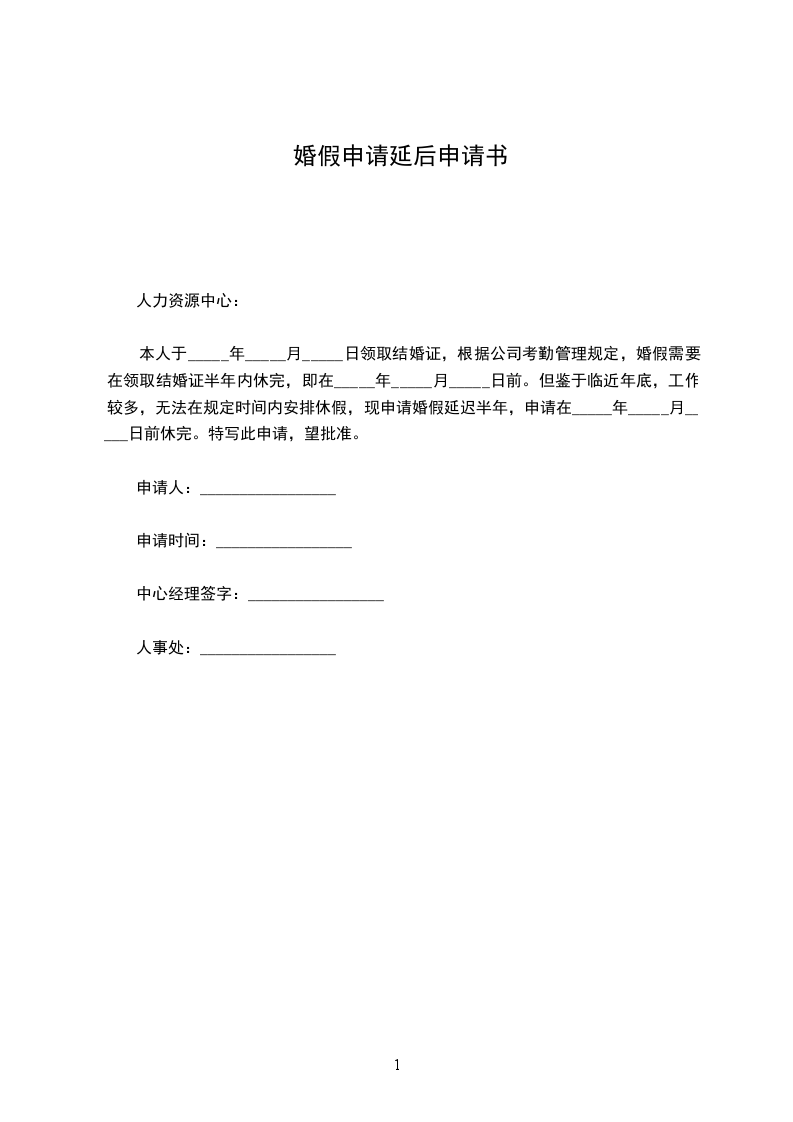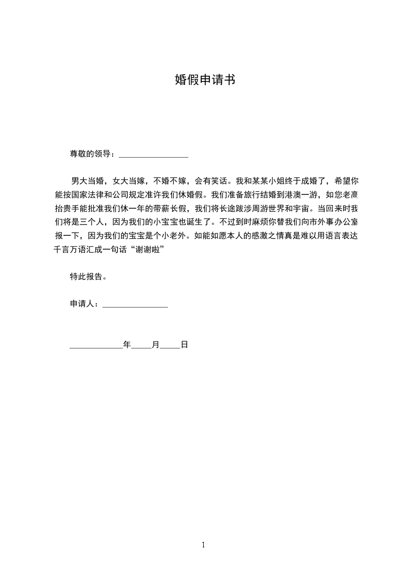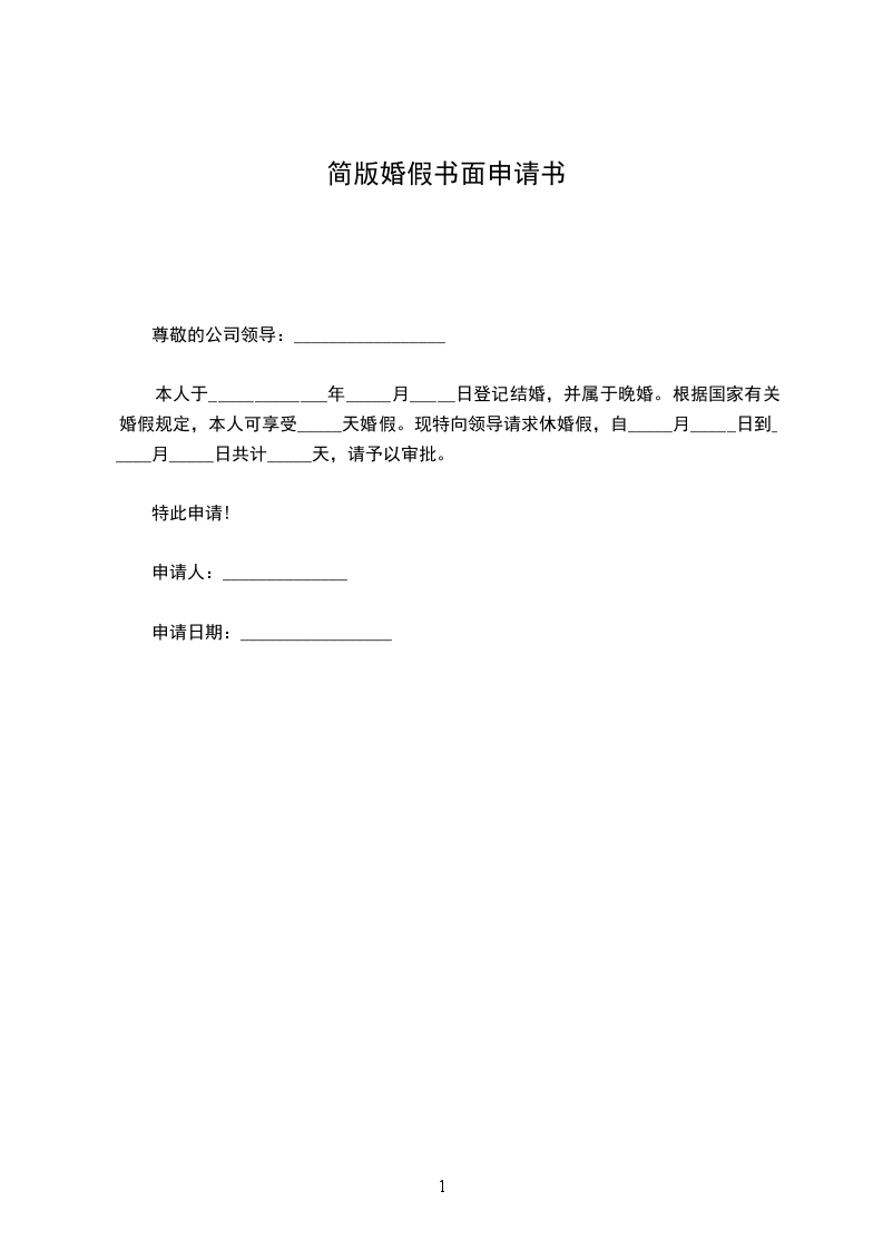本人于________年________月________日登记结婚,并属于晚婚。根据国家有关婚嫁规定,本人可享受_____天婚嫁。现特向领导请求休婚假,自________月________日到________月________日共计_____天,请予以审批。
