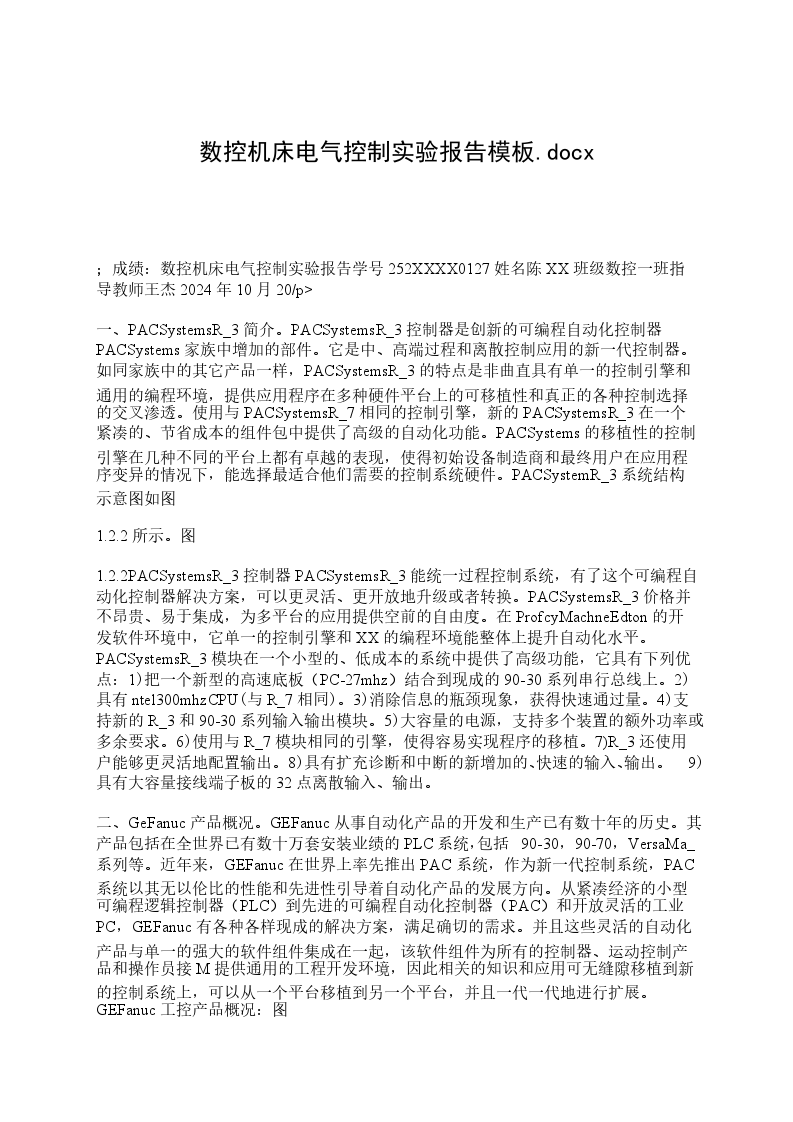 ;成绩:数控机床电气控制实验报告学号252XXXX0127姓名陈XX班级数控一班指导教师王杰2024年10月20/p>