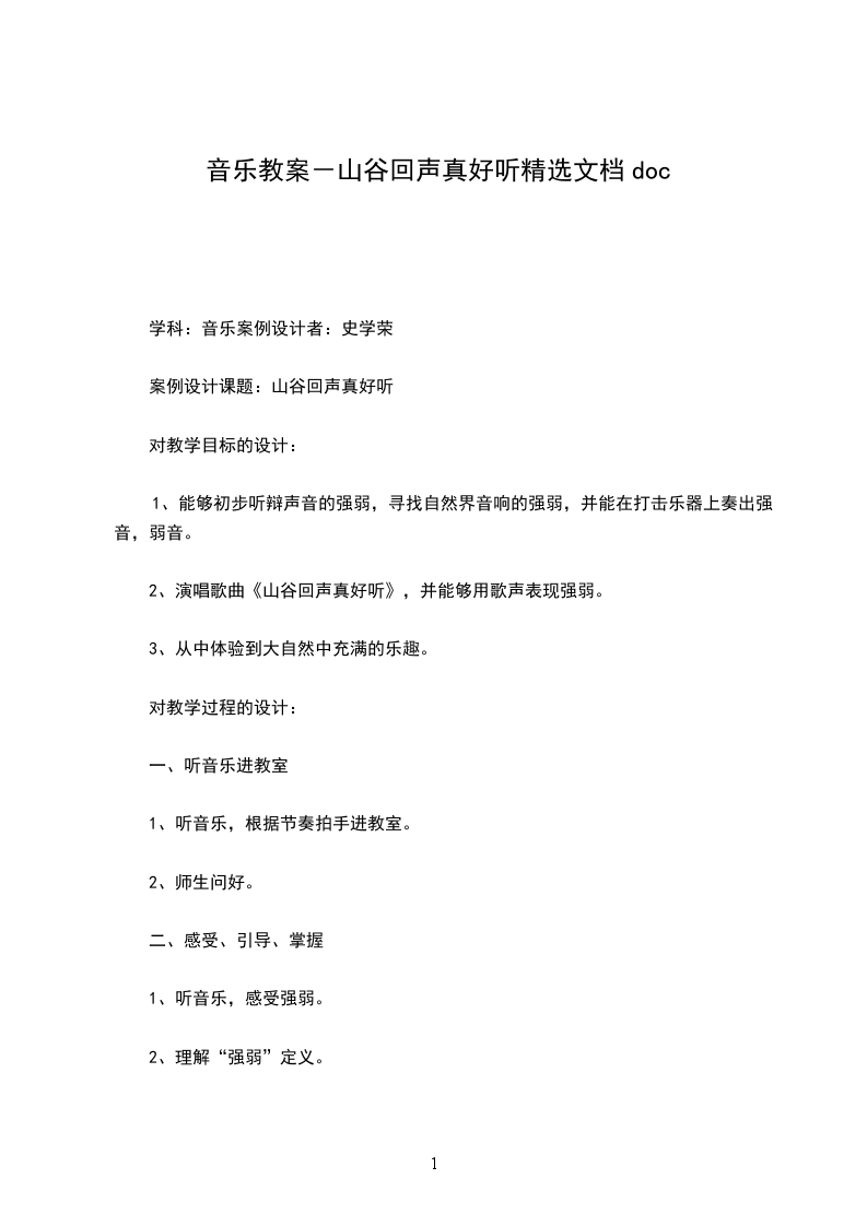 六、课堂小结同学们,今天我们学唱了山谷回音真好听,还编了很有新意的歌词。难道你们不想再亲自去山谷听一听回音吗?可惜由于时间关系我们不得不对着山谷说:再见了!同学们向你们的山谷再见,向你们的回音再见!板书:原声回声F强p弱山谷回音真好听说课稿