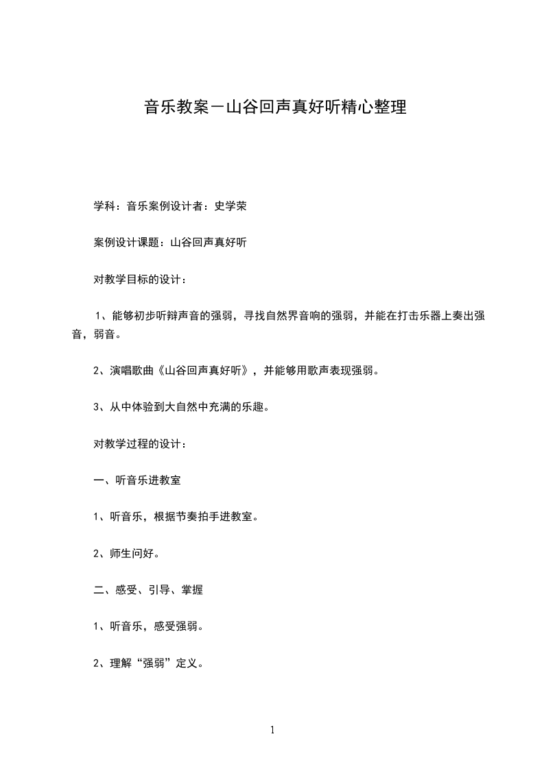 二、教学目标知识目标:用轻快、优美的声音演唱山谷回音真好听。能力目标:能用歌声表现声音的强弱。能自然地、有表情地歌唱,乐于参与音乐表现和即兴创造活动。情感目标:通过演唱、聆听、让学生感受声音的美和大自然的美,了解“回声”这一自然现象。