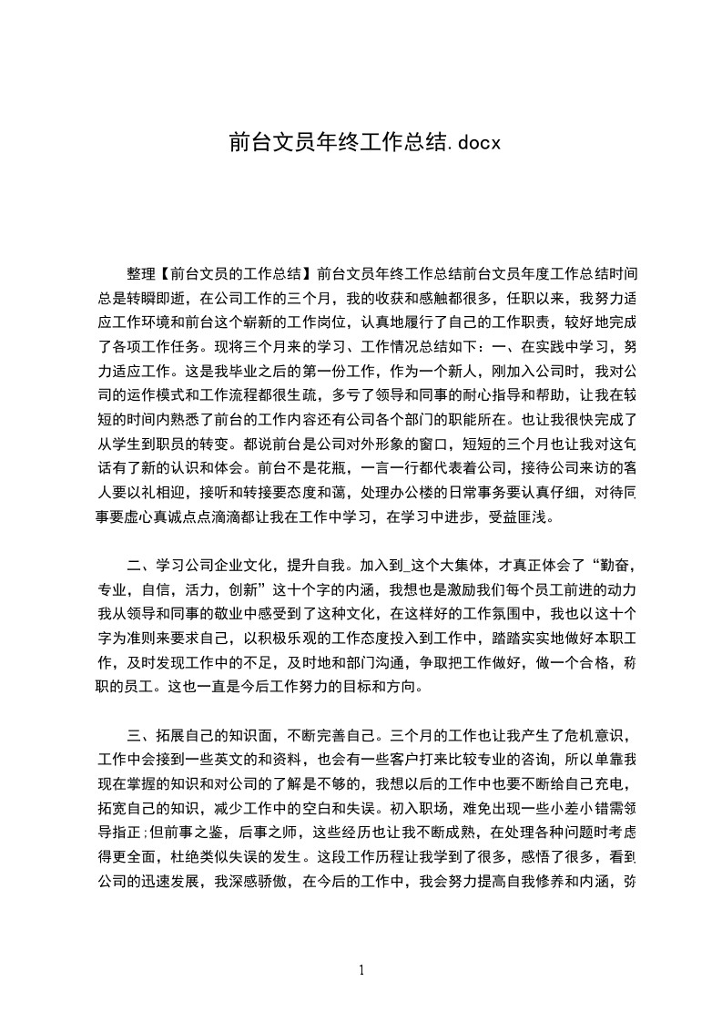 整理【前台文员的工作总结】前台文员年终工作总结前台文员年度工作总结时间总是转瞬即逝,在公司工作的三个月,我的收获和感触都很多,任职以来,我努力适应工作环境和前台这个崭新的工作岗位,认真地履行了自己的工作职责,较好地完成了各项工作任务。现将三个月来的学习、工作情况总结如下:一、在实践中学习,努力适应工作。这是我毕业之后的第一份工作,作为一个新人,刚加入公司时,我对公司的运作模式和工作流程都很生疏,多亏了领导和同事的耐心指导和帮助,让我在较短的时间内熟悉了前台的工作内容还有公司各个部门的职能所在。也让我很快完成了从学生到职员的转变。都说前台是公司对外形象的窗口,短短的三个月也让我对这句话有了新的认识和体会。前台不是花瓶,一言一行都代表着公司,接待公司来访的客人要以礼相迎,接听和转接要态度和蔼,处理办公楼的日常事务要认真仔细,对待同事要虚心真诚点点滴滴都让我在工作中学习,在学习中进步,受益匪浅。