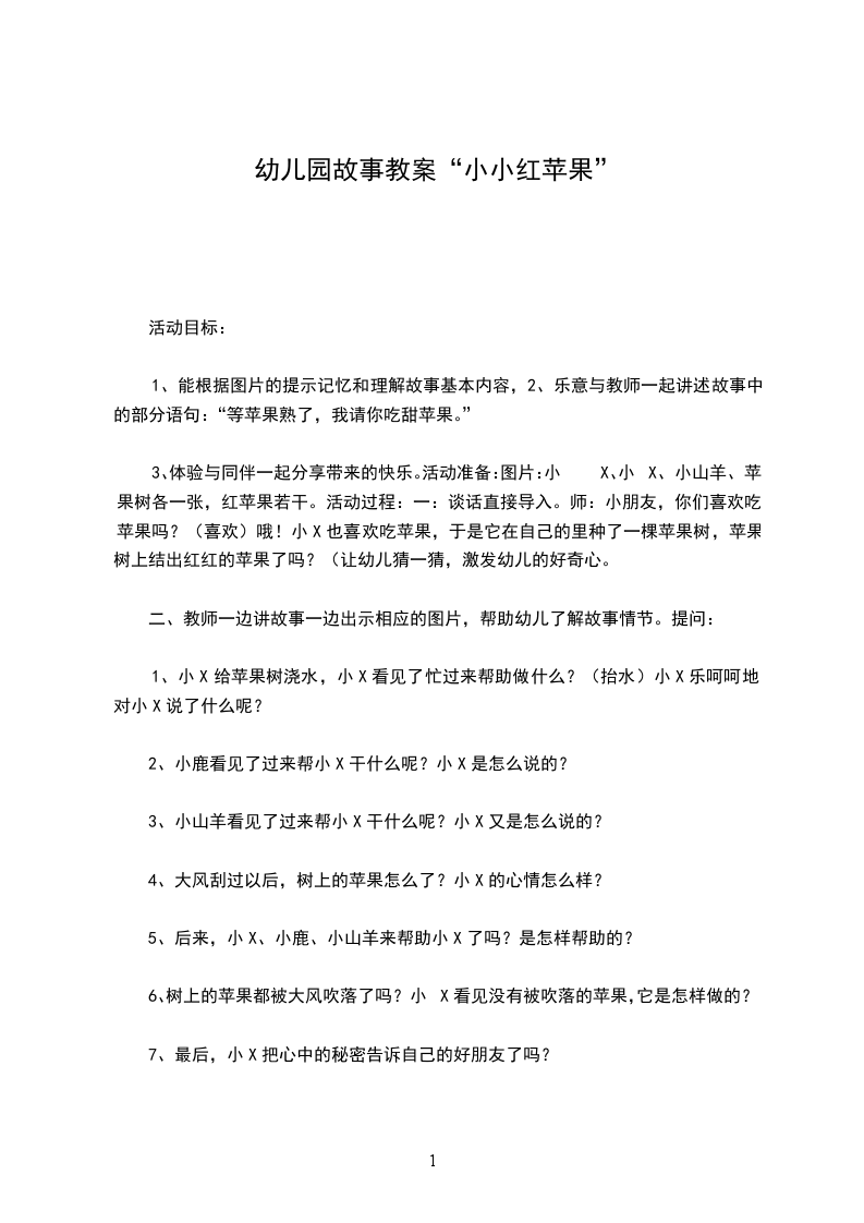 3、体验与同伴一起分享带来的快乐。活动准备:图片:小X、小X、小山羊、苹果树各一张,红苹果若干。活动过程:一:谈话直接导入。师:小朋友,你们喜欢吃苹果吗?(喜欢)哦!小X也喜欢吃苹果,于是它在自己的里种了一棵苹果树,苹果树上结出红红的苹果了吗?(让幼儿猜一猜,激发幼儿的好奇心。