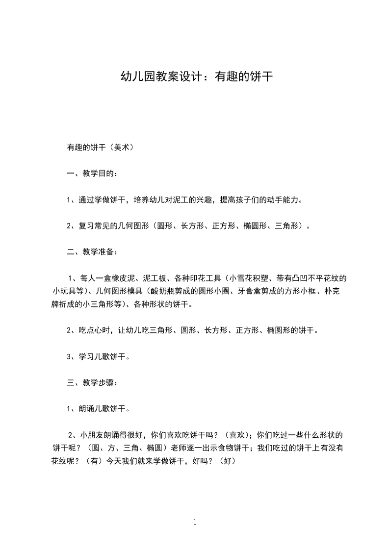 2、小朋友朗诵得很好,你们喜欢吃饼干吗?(喜欢);你们吃过一些什么形状的饼干呢?(圆、方、三角、椭圆)老师逐一出示食物饼干;我们吃过的饼干上有没有花纹呢?(有)今天我们就来学做饼干,好吗?(好)