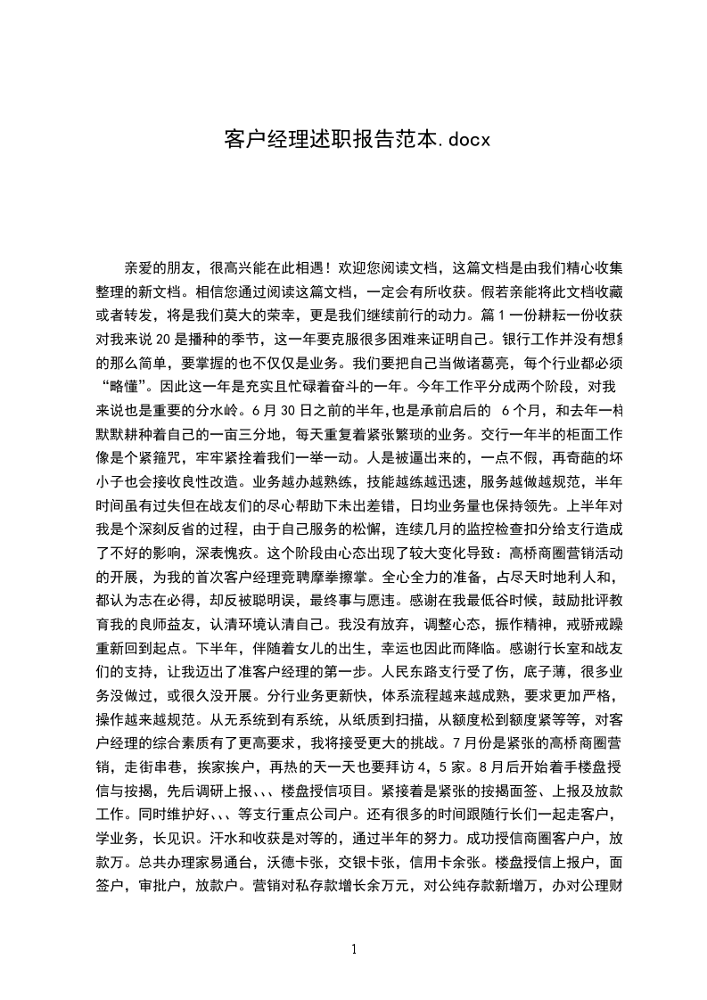 亲爱的朋友,很高兴能在此相遇!欢迎您阅读文档,这篇文档是由我们精心收集整理的新文档。相信您通过阅读这篇文档,一定会有所收获。假若亲能将此文档收藏或者转发,将是我们莫大的荣幸,更是我们继续前行的动力。篇1一份耕耘一份收获,对我来说20是播种的季节,这一年要克服很多困难来证明自己。银行工作并没有想象的那么简单,要掌握的也不仅仅是业务。我们要把自己当做诸葛亮,每个行业都必须“略懂”。因此这一年是充实且忙碌着奋斗的一年。今年工作平分成两个阶段,对我来说也是重要的分水岭。6月30日之前的半年,也是承前启后的6个月,和去年一样默默耕种着自己的一亩三分地,每天重复着紧张繁琐的业务。交行一年半的柜面工作,像是个紧箍咒,牢牢紧拴着我们一举一动。人是被逼出来的,一点不假,再奇葩的坏小子也会接收良性改造。业务越办越熟练,技能越练越迅速,服务越做越规范,半年时间虽有过失但在战友们的尽心帮助下未出差错,日均业务量也保持领先。上半年对我是个深刻反省的过程,由于自己服务的松懈,连续几月的监控检查扣分给支行造成了不好的影响,深表愧疚。这个阶段由心态出现了较大变化导致:高桥商圈营销活动的开展,为我的首次客户经理竞聘摩拳擦掌。全心全力的准备,占尽天时地利人和,都认为志在必得,却反被聪明误,最终事与愿违。感谢在我最低谷时候,鼓励批评教育我的良师益友,认清环境认清自己。我没有放弃,调整心态,振作精神,戒骄戒躁,重新回到起点。下半年,伴随着女儿的出生,幸运也因此而降临。感谢行长室和战友们的支持,让我迈出了准客户经理的第一步。人民东路支行受了伤,底子薄,很多业务没做过,或很久没开展。分行业务更新快,体系流程越来越成熟,要求更加严格,操作越来越规范。从无系统到有系统,从纸质到扫描,从额度松到额度紧等等,对客户经理的综合素质有了更高要求,我将接受更大的挑战。7月份是紧张的高桥商圈营销,走街串巷,挨家挨户,再热的天一天也要拜访4,5家。8月后开始着手楼盘授信与按揭,先后调研上报、、、楼盘授信项目。紧接着是紧张的按揭面签、上报及放款工作。同时维护好、、、等支行重点公司户。还有很多的时间跟随行长们一起走客户,学业务,长见识。汗水和收获是对等的,通过半年的努力。成功授信商圈客户户,放款万。总共办理家易通台,沃德卡张,交银卡张,信用卡余张。楼盘授信上报户,面签户,审批户,放款户。营销对私存款增长余万元,对公纯存款新增万,办对公理财万。对公新开户户,对公机构户户,对公网银动户户,对公有效户户,基本完成支行考核指标。后半年的工作基本都是第一次。半路出家的我由于业务生疏,四处碰壁,摔了不少大小跟头,吸取了很多经验和教训。为了不拖后腿,赶上进度,经常加班加点,对支行安排的任务严格要求自己按质按量完成。非常感谢行长们的精心照顾和耐心栽培,现在的我一些业务基本可以独挡一面。由衷感谢战友们对我工作的全力协助和鼎力帮扶,是你们让我的工作更加效率更加完美更加开心。往后还需要大家一如既往的支持厚爱,我的成长离不开你们。宝XX从磨砺出,梅花香自苦寒来,20的磨练,20的翱翔。现在的我离优秀的要求还有较大差距,有很多业务没有接触或没有掌握。明年需更全面的熟悉业务,更努力的做出业绩。虽如今人艰不拆,但我坚信这是一个能够提升自我实现理想的平台,继续保持正能量,决不放弃治疗,明年一定硕果满载!篇2尊敬的各位领导,各位同事:4大家好!告别20年,我们迎来新的开端。今天是20年1月8日,也是我入行一年零187天的日子。在过去的一里,有收获也有缺憾,现将一年工作总结如下:在营销工作方面,截止20年12月31日,营销POSM5台,办理三方存管26户,上交信用卡102张,储蓄存款元,对公存款万元。再次面对这些数字,依然喜忧参半。喜的是经过努力,收获还是有的;譬如外出营销,陌生拜访客户,在办理了信用卡的同时,挖掘储蓄120多万。忧的是,相对于一年的时间,这些数字总是显得那么寒碜。当然这跟营销的方式方法有关,也跟坚持的态度相关。在最初营销客户的时候,不懂得如何接近客户,如何挖掘客户需求,在面对不同客户的时候,并没有做到细分,更没有做到精准细致化的应对,营销课前的准备工作做的不好,直接导致营销的效果不够好。磨刀不误砍柴工,说的就是这个道理吧!在今后的工作中,我会多向成熟的客户经理学习,加强这方面的锻炼,真正做到根据客户的不同需求和实际情况交叉销售,而不是简单地推荐一张信用卡,一台POSMo在日常工作中,遵守行里的规章制度,通过跟客户经理学习对公业务,熟悉并能办理出口押汇、进口开证等业务。在这里还要感谢每一位给予我指导和帮助的客户经理!同时多学习银行产品知识,参加并通过了行里组织的岗位资格考试。20年10月通过了银行业从业资格考试,20年11月通过经济师考试。我深知,只有学习,积累点滴,才能不断进步,努力提高自身素质和营销能力。在社区营销方面,自20年8月开始,做了近一个多月社区营销,储蓄存款170多万。11月份开始老年大学营销活动,和单位同事一起为老年大学学员发放爱心白菜,元旦前后送福字挂历宣传营销活动。截止今天,新增60多万。存款不多,效果也不够明显,看看各兄弟支行,比比差距,有时候想想,心里总有些失落。但我相