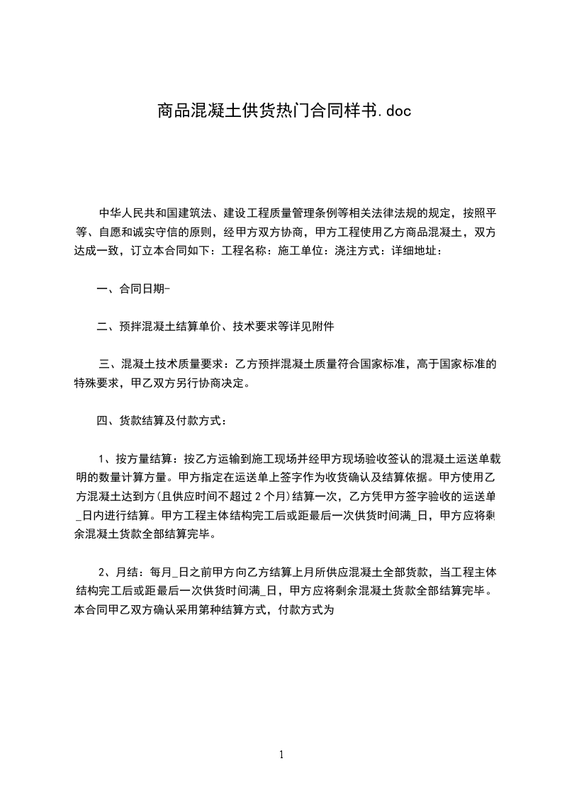 中华人民共和国建筑法、建设工程质量管理条例等相关法律法规的规定,按照平等、自愿和诚实守信的原则,经甲方双方协商,甲方工程使用乙方商品混凝土,双方达成一致,订立本合同如下:工程名称:施工单位:浇注方式:详细地址:
