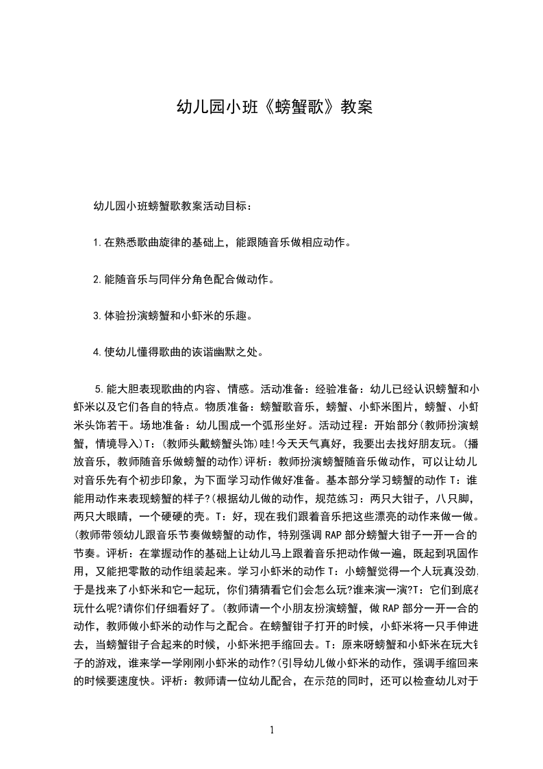 3、幼儿探索制作,教师提醒幼儿拼一拼摆一摆然后再作。教学反思在这节课我让幼儿自己观察,探究思考,虽然对螃蟹的基本形状不同动态都能基本掌握,但作画的效果并不是很理想。原因是我的示范画左右了幼儿独立思考,造成了幼儿的画千篇一律,缺少个性、没有创意。另外,虽然说大班幼儿能用一些简单的线条来表现物体,但螃蟹的形态比较多它的造型很难把握,因此仅在课堂上很短的时间内完成螃蟹的结构特征、动态绘画、添加背景难度有点大。小百科:绝大多数种类的螃蟹生活在海里或近海区,也有一些栖于淡水或陆地。它们靠母蟹来生小螃蟹,每次母蟹都会产很多的卵,数量可达数百万粒以上。