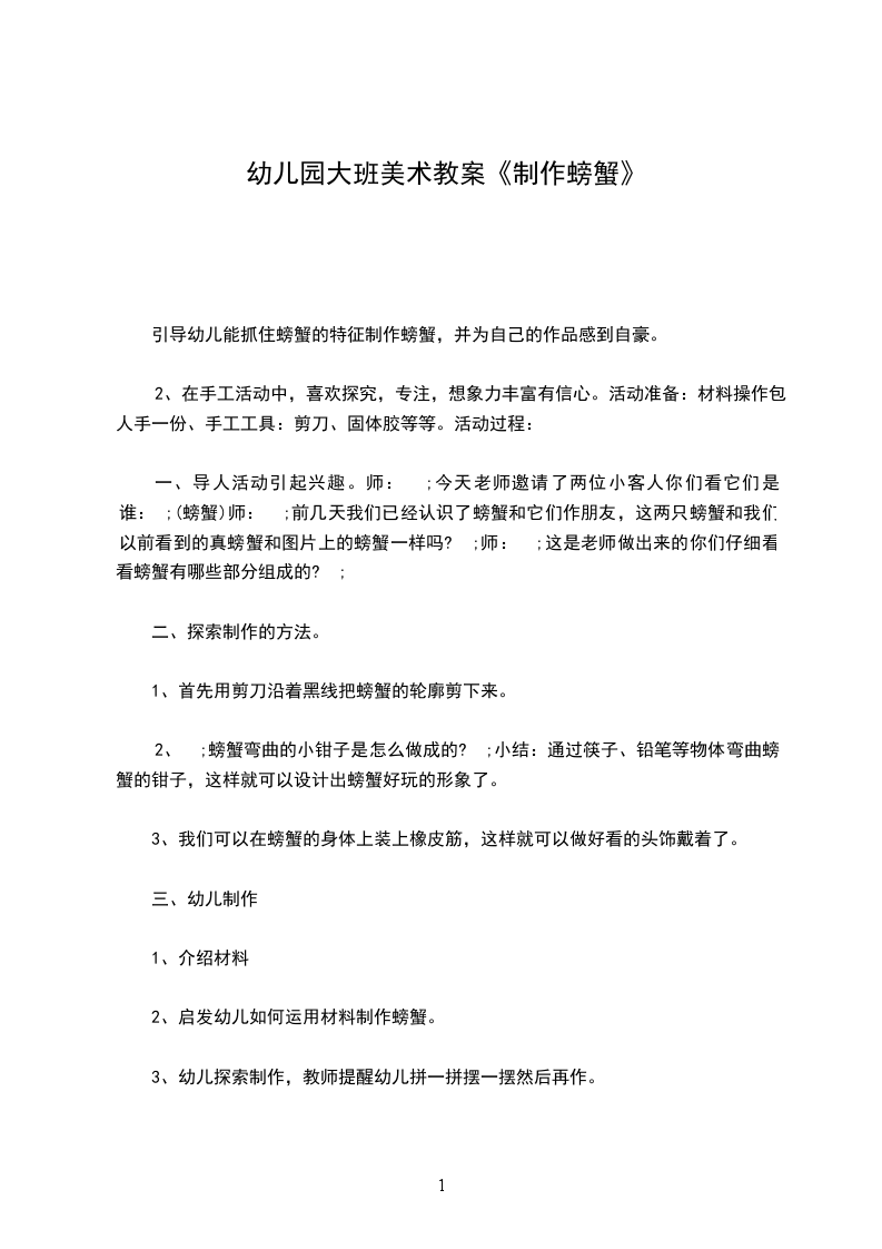 1.引导幼儿能抓住螃蟹的特征制作螃蟹,并为自己的作品感到自豪。