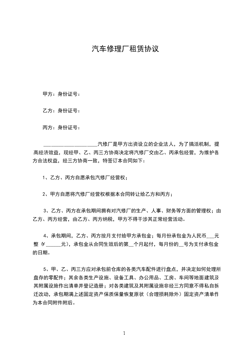 _____________________汽修厂是甲方出资设立的企业法人,为了搞活机制,提高经济效益,现经甲、乙、丙三方协商决定将汽修厂交由乙、丙承包经营,为维护各方合法权益,经三方协商一致,特签订本合同如下: