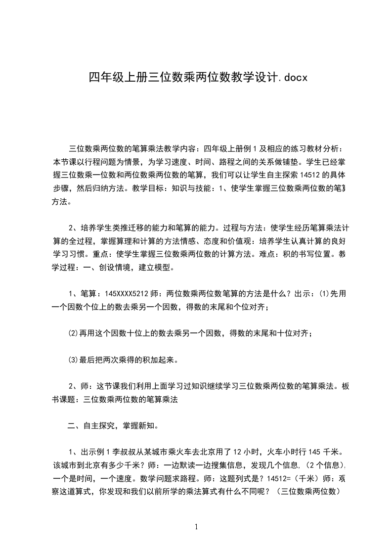 三位数乘两位数的笔算乘法教学内容:四年级上册例1及相应的练习教材分析:本节课以行程问题为情景,为学习速度、时间、路程之间的关系做铺垫。学生已经掌握三位数乘一位数和两位数乘两位数的笔算,我们可以让学生自主探索14512的具体步骤,然后归纳方法。教学目标:知识与技能:1、使学生掌握三位数乘两位数的笔算方法。