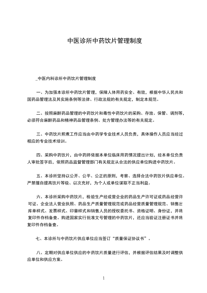 一、为加强本诊所中药饮片管理,保障人体用药安全、有效,根据中华人民共和国药品管理法及其实施条例等法律、行政法规的有关规定,制定本规范。