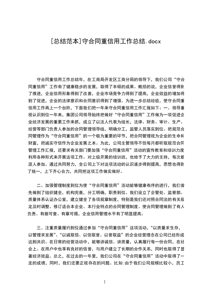 守合同重信用工作总结年,在工商局开发区工商分局的领导下,我们公司“守合同重信用”工作有了健康稳步的发展,取得了丰硕的成果。概括的说,企业信誉得到了推进,企业信用形象得到了改善,企业市场竞争力得到了提高,企业效益的增加得到了促进,企业的法律意识和合同意识得到了增强。为进一步总结经验,使守合同重信用工作再上一个台阶,下面我们把一年来守合同重信用工作汇报如下:一、领导重视认识到位一年来,集团公司领导始终把做好“守合同重信用”工作做为一项促进企业经济发展的重要工作来抓,成立了以法人代表为组长,法律、财务、审计、生产、经营等部门负责人参加的合同管理领导组,明确分工,监管人员落实到位。把规范合同管理作为“守合同重信用”的一个极为重要的环节,把合同管理视为企业的生命和财富,把诚实守信作为企业发展之本。为此,公司主管领导不但每月都听取规范合同管理工作汇报,还要求有关部门要加强“守合同重信用”活动的宣传教育和培训力度,利用各种形式来开展这项工作。对上级开展的培训班,也给予了大力的支持,每次都派人参加。通过共同努力,全公司上下对这项活动的认识逐步得到提高,思想也得到了统一,上下齐心合力,共同把这项工作做实做好。