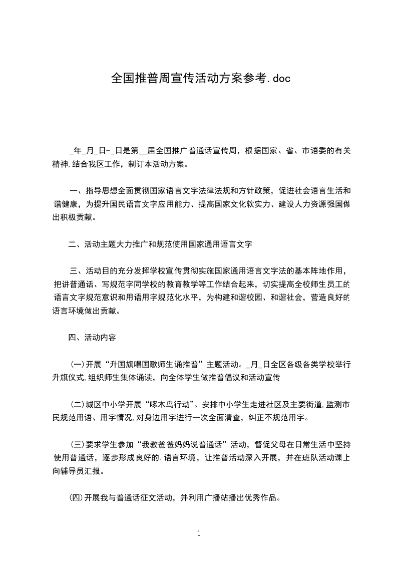 _年_月_日-_日是第__届全国推广普通话宣传周,根据国家、省、市语委的有关精神,结合我区工作,制订本活动方案。