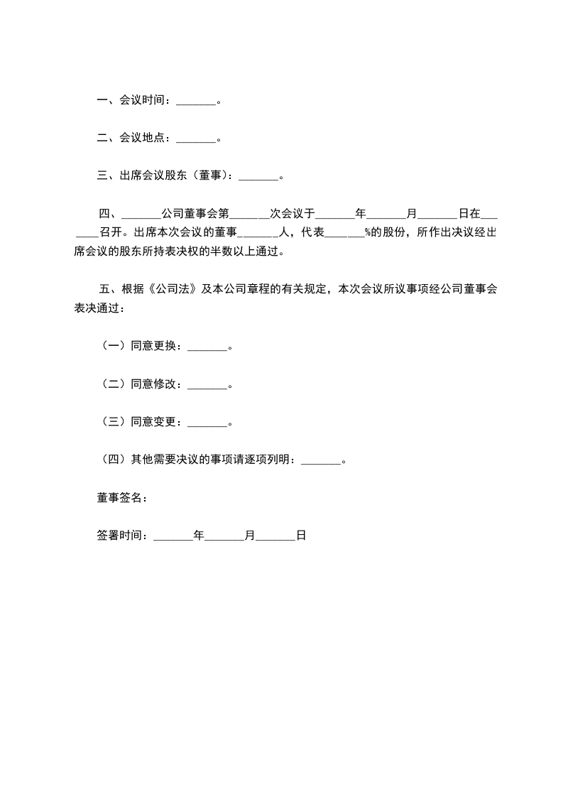 鉴于_____________有限公司经股东大会决议更换了公司董事,根据《公司法》和公司章程规定,召开本次临时董事会会议。股东大会选举产生的新一届董事会全体成员_______________、_______________、_______________、_______________、_______________出席了本次董事会会议,会议由_______________主持,一致通过并决议如下: