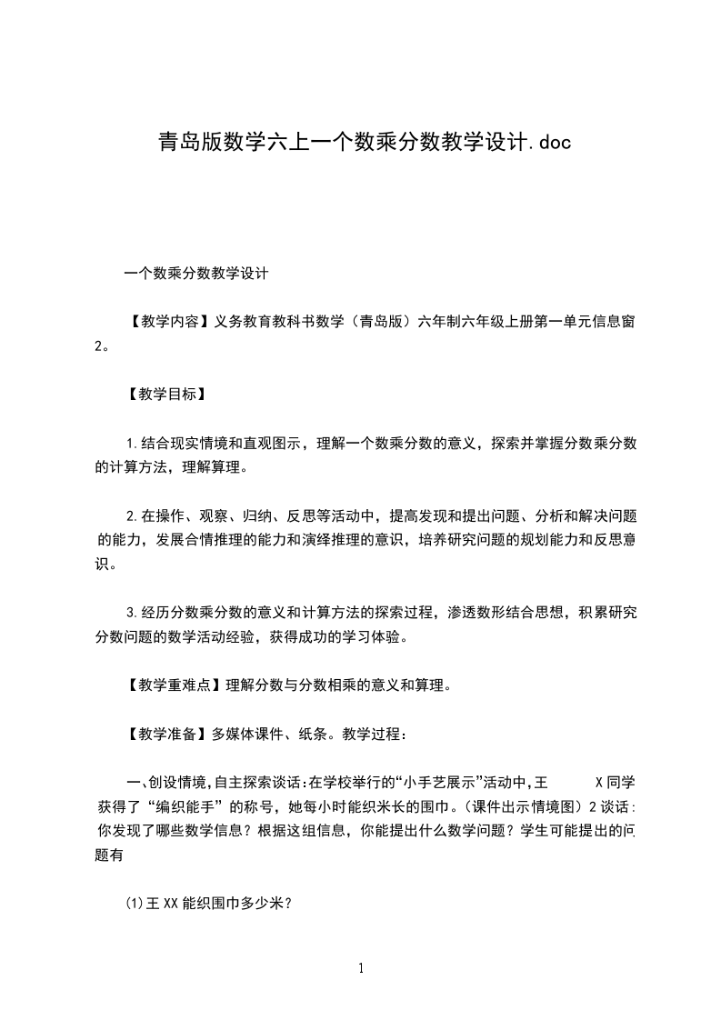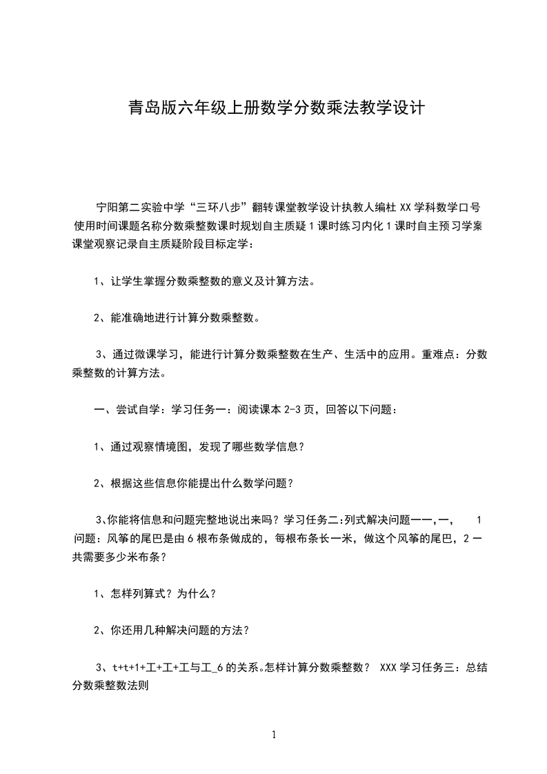 3.谈话:怎样列式?你是怎么想的?学生口头列式并说想法,教师板书算式。引导学生说出数量关系:每小时织的米数时间=织的总米数。谈话:2上节课已经学过,表示什么意义?小结:2求的是2个是多少或的2倍是多少,结果得。提问:观察下面两个算式跟上面的有什么不同?谈话:这节课我们就一起来研究一个数乘分数。(板书课题)
