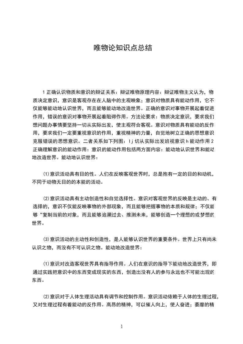 1.物质决定意识原理内容唯物论认为:世界的本质是物质,物质第一性,意识第二性,物质决定意识,意识是物质的反映。方法论要求我们一切从实际出发,实事求是。