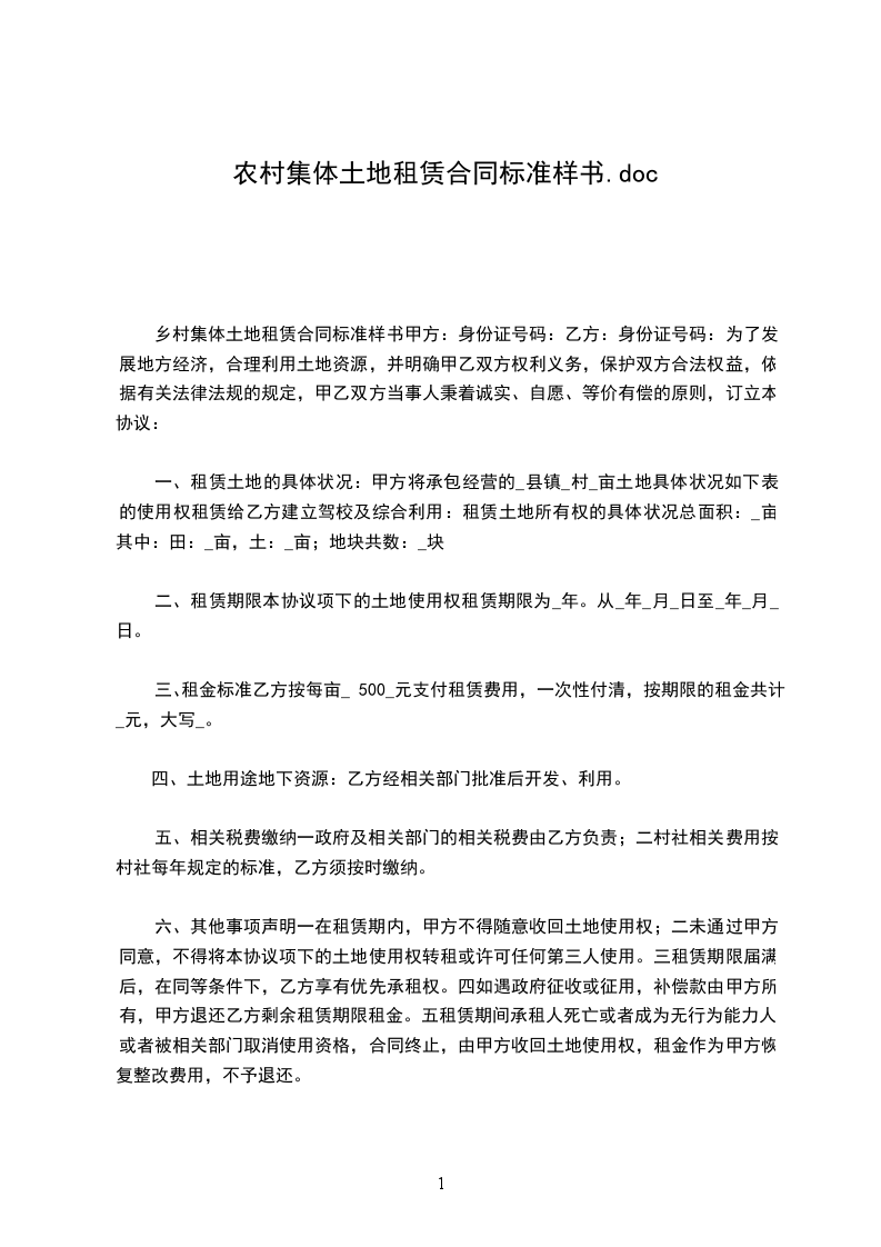 乡村集体土地租赁合同标准样书甲方:身份证号码:乙方:身份证号码:为了发展地方经济,合理利用土地资源,并明确甲乙双方权利义务,保护双方合法权益,依据有关法律法规的规定,甲乙双方当事人秉着诚实、自愿、等价有偿的原则,订立本协议: