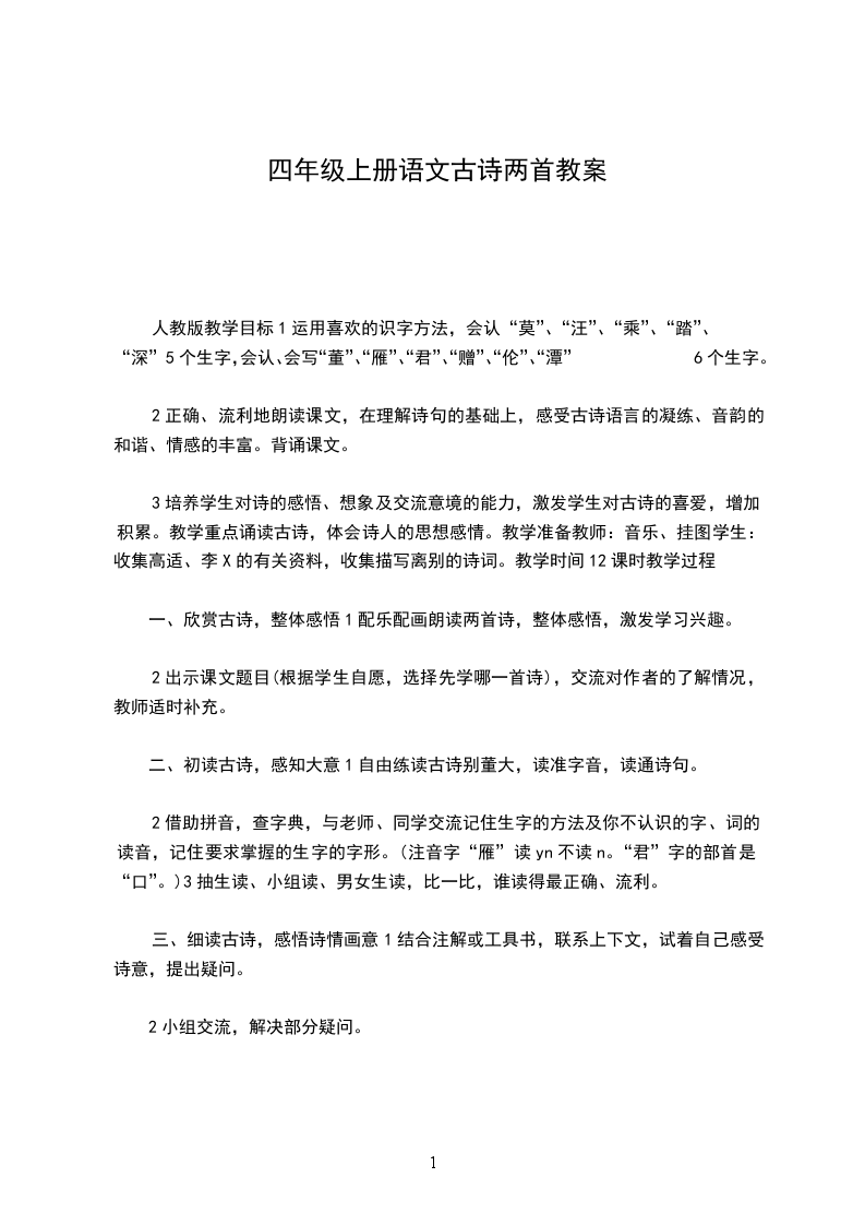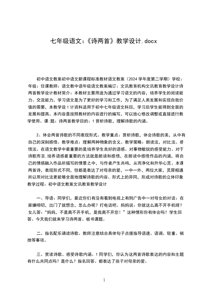 初中语文教案初中语文新课程标准教材语文教案(2024学年度第二学期)学校:年级:任课教师:语文教中语年级语文教案编订:文讯教育机构文讯教育教学设计诗两首教学设计教材简介:本教材主要用途为通过学习语文的内容,培养学生的阅读能力、交流能力,学习语文是为了更好的学习和工作,为了满足人类发展和实现自我价值的需要,本教学设1计资料适用于初中七年级语文科目,学习后学生能得到全面的发展和提高。本内容是按照教材的内容进行的编写,可以放心修改调整或直接进行教学使用。课:题:诗两首教学目的:1赏析诗歌,理解诗歌的内涵。