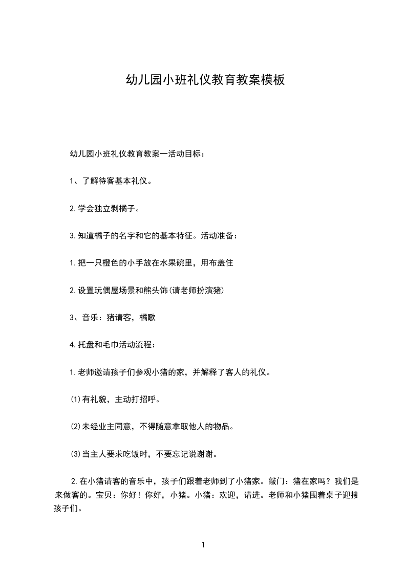 8.老师和小朋友唱着桔子歌告别小猪,回到教室。幼儿园小班礼仪教育教案2活动目标: