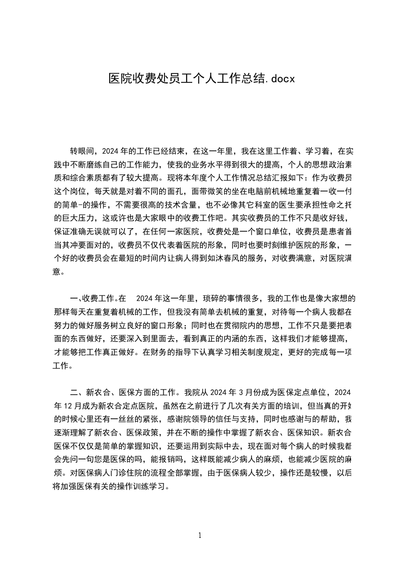 转眼间,2024年的工作已经结束,在这一年里,我在这里工作着、学习着,在实践中不断磨练自己的工作能力,使我的业务水平得到很大的提高,个人的思想政治素质和综合素质都有了较大提高。现将本年度个人工作情况总结汇报如下:作为收费员这个岗位,每天就是对着不同的面孔,面带微笑的坐在电脑前机械地重复着一收一付的简单-的操作,不需要很高的技术含量,也不必像其它科室的医生要承担性命之托的巨大压力,这或许也是大家眼中的收费工作吧。其实收费员的工作不只是收好钱,保证准确无误就可以了,在任何一家医院,收费处是一个窗口单位,收费员是患者首当其冲要面对的,收费员不仅代表着医院的形象,同时也要时刻维护医院的形象,一个好的收费员会在最短的时间内让病人得到如沐春风的服务,对收费满意,对医院满意。