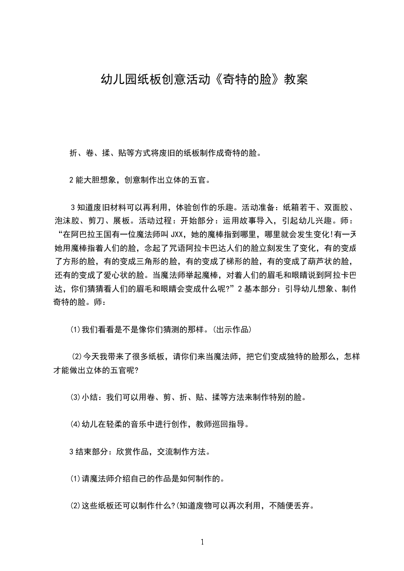 【幼儿园纸板创意活动奇特的脸教案】