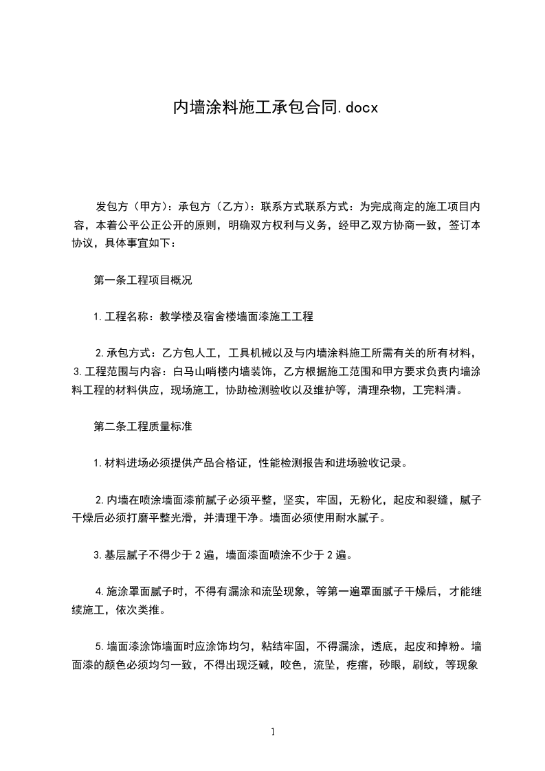 2.承包方式:乙方包人工,工具机械以及与内墙涂料施工所需有关的所有材料,3.工程范围与内容:白马山哨楼内墙装饰,乙方根据施工范围和甲方要求负责内墙涂料工程的材料供应,现场施工,协助检测验收以及维护等,清理杂物,工完料清。