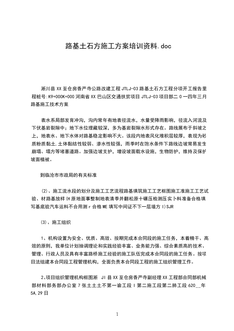 淅川县XX至仓房香严寺公路改建工程JTLJ-03路基土石方工程分项开工报告里程桩号:K9+000K+000河南省XX巴山区交通扶贫项目JTLJ-03项目部二0一四年三月路基施工技术方案