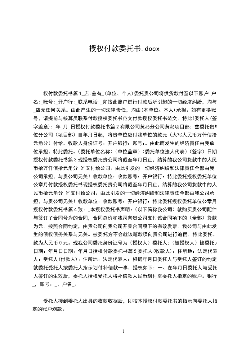 权付款委托书篇1_店:兹有_(单位、个人)委托贵公司将供货款付至以下账户:户名:_账号:_开户行:_联系电话:_如按此账户进行付款后所引起的一切经济纠纷,均与_店无任何关系。由此产生的一切法律责任,均由(本单位、本人)承担。如有更换账号,请提前与核算员联系付款授权委托书范文付款授权委托书范文。特此!委托人(签字盖章):_年_月_日授权付款委托书篇2有限公司黄岛分公司黄岛项目部:兹委托贵单位分公司(项目部)自年月日起,将贵单位应付我单位的款元(大写人民币万仟佰拾元角分)付给。收款人身份证号:开户银行:账号:。由此而发生的经济责任由我单位承担。特此委托。(委托单位名称)(单位盖章)(委托单位法人代表)(签字)日期授权付款委托书篇3现授权委托贵公司将截至年月日止,结算的我公司货款中的人民币拾万仟佰拾元角分(¥支付给公司。由此引发的一切经济纠纷和法律责任全部由我公司承担,与贵公司无关!收款单位:收款账号:开户银行:特此委托授权委托单位公章月付款授权委托书现授权委托贵公司将截至年月日止,结算的我公司货款中的人民币拾元角分(¥支付给公司。由此引发的一切经济纠纷和法律责任全部由我公司承担,与贵公司无关!收款单位:收款账号:开户银行:特此委托授权委托单位公章月授权付款委托书篇4致:_本授权委托书声明:(以下简称我公司)就购买贵公司配件,与签订了合同号为的合同,合同总价和我司向贵公司支付该合同项下的(全部)货款为元。按照合同约定,由贵公司向我公司开具合同项下的有效发票。我公司与由此发生的债权债务关系与无关。被委托方不会就该笔款项向贵公司进行追偿。特此委托。款为人民币0元。现我公司委托身份证号为(授权人)委托人:(被授权人)被委托人:日期:年月日日期:年月日授权付款委托书篇5委托人(收款人):住所地:法定代表人:受托人(付款人):住所地:法定代表人:根据年月日委托人与受托人签订的约定,就委托受托人按委托人指示划付补偿款一事,授权如下:一、在年月日委托人与受托人签订的生效后,委托人授权受托人将补偿款人民币划付至委托人指定的账户。银行:_,账号:_,户名_。
