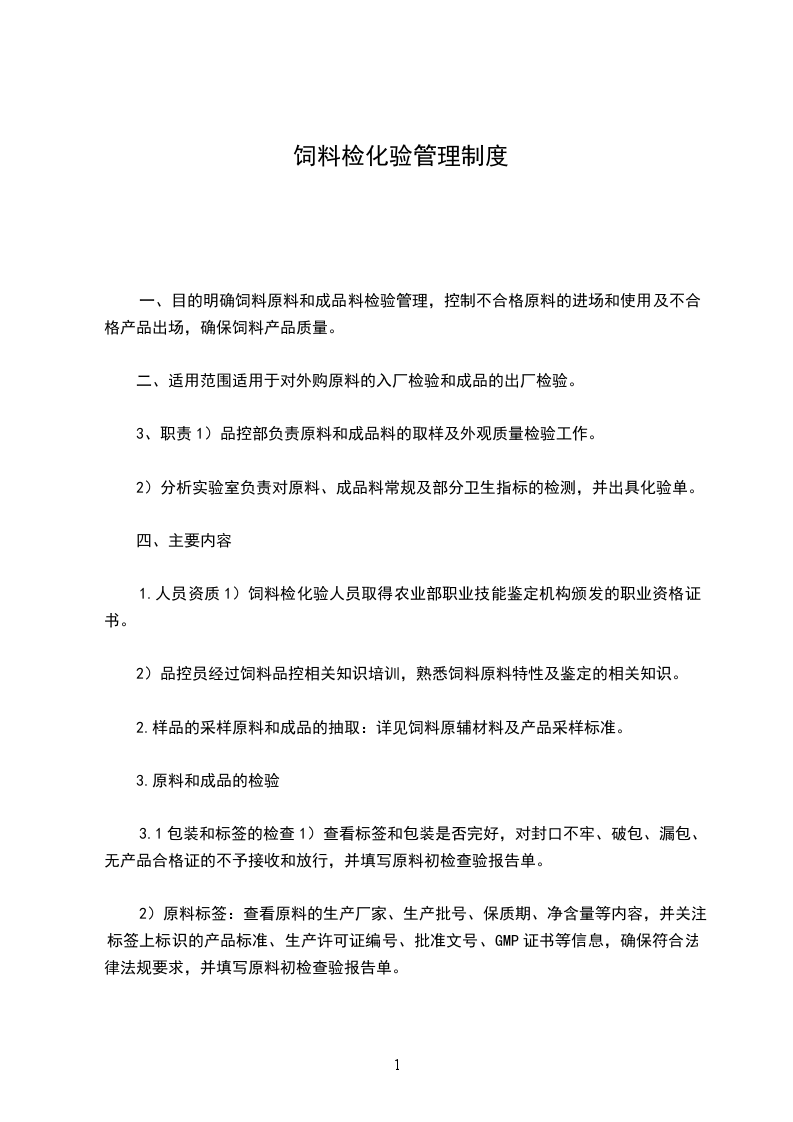 一、目的明确饲料原料和成品料检验管理,控制不合格原料的进场和使用及不合格产品出场,确保饲料产品质量。