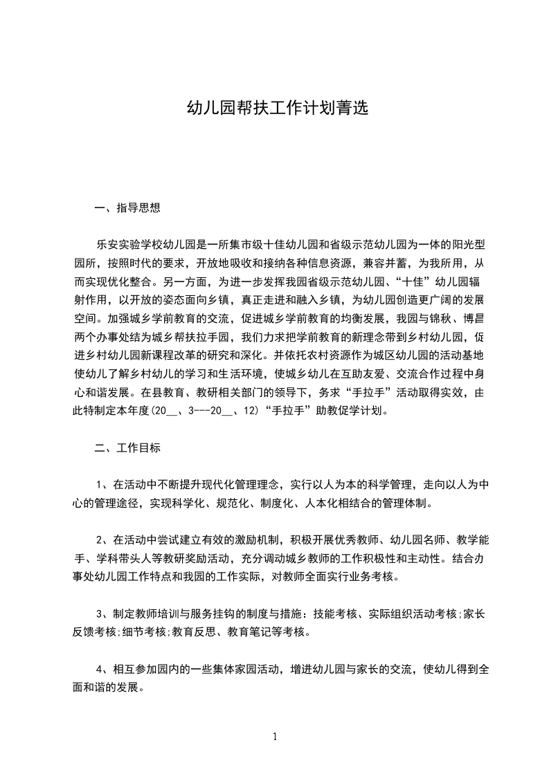 篇一:__年幼儿园结对帮扶计划__年中心幼儿园结对帮扶计划为进一步加强农村学前教育的帮扶工作,提高农村教育教学质量,切实发挥示范性幼儿园的示范带动作用,引导优质学前教育资源向农村地区辐射和拓展,进一步提高农村幼儿园办园水平,我园和龙石中心幼儿园进行对口结对帮扶,特制定如下计划: