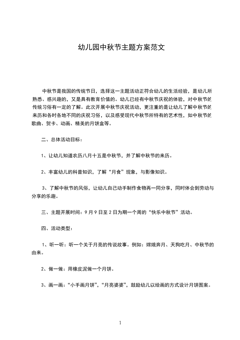 4、艺术:欣赏各种各样的月饼盒包装、设计月饼图案、我为妈妈做灯笼歌曲爷爷为我打月饼、月亮婆婆喜欢我。中秋的月儿圆圆、中秋的月饼香香,中秋的话儿甜甜,中秋的快乐多多?希望通过中秋节的系列主题活动,让孩子们了解中国传统节日的许多习俗,更让孩子学会分享、体验活动带来的乐趣吧。幼儿园中秋节主题方案2活动目的:通过各种活动让幼儿知道阴历八月十五是中秋节,初步了解中秋节的来历,知道中秋节是我国的传统节日。让幼儿通过品尝月饼,制作水果拼盘,月饼拼盘等活动体验节日的快乐。通过活动,促进亲子交流,增进幼儿与家长之间的感情。体验节日的快乐。活动准备:水果、月饼家长提供。呼啦圈、气球若干个。一次性水果盘活动过程:第一环节:介绍中秋节的第二环节:亲子其乐融融亲子游戏:蜈蚣散步先讲一个故事:森林里举行运动会,蜈蚣报名参加了赛跑。一大早蜈蚣妈妈就把小蜈蚣从床上拉了起来,叫他吃好早饭后赶到比赛现场。说完妈妈便到屋后菜园种菜去了。好半天,忽然听见小兔在喊:蜈蚣,蜈蚣,比赛快开始啦!你怎么还不去呀?蜈蚣妈妈想着:这孩子跑到哪去了?推开门一看,可把她吓了一跳。原来小蜈蚣在忙着穿鞋呢。他的脚太多太多,穿了好半天都还没穿完。目的:锻炼孩子的耐力和腿部力量。准备:给孩子看蜈蚣的图片,让孩子知道蜈蚣走路的方式。